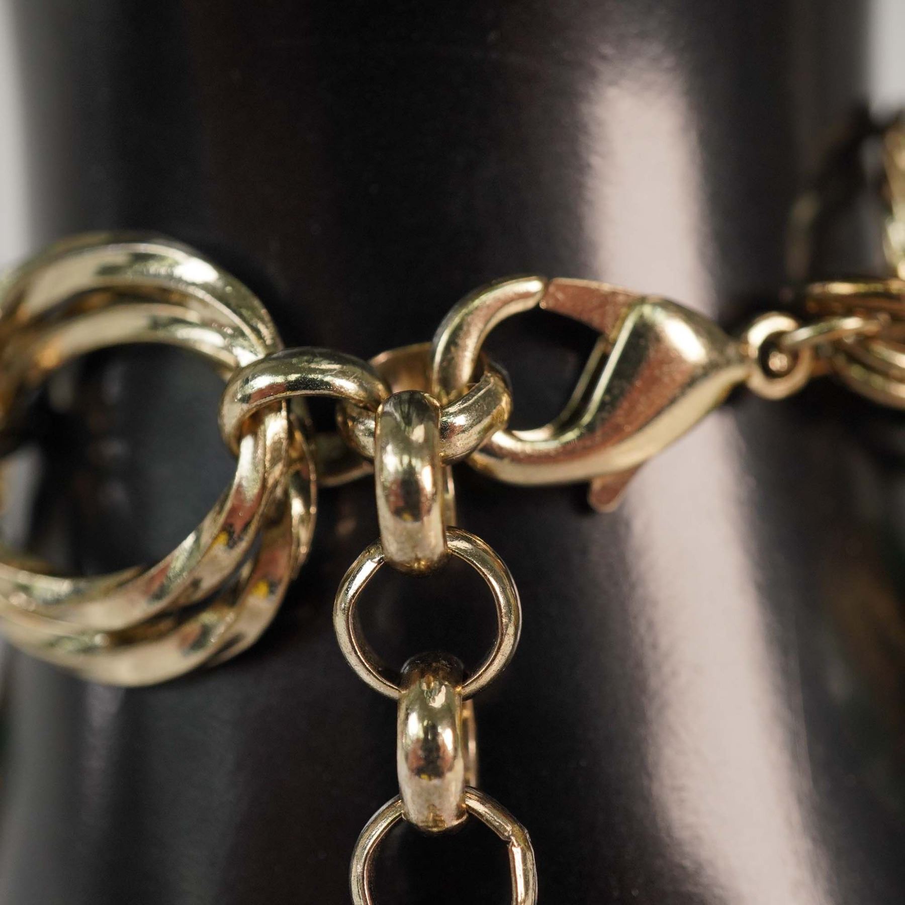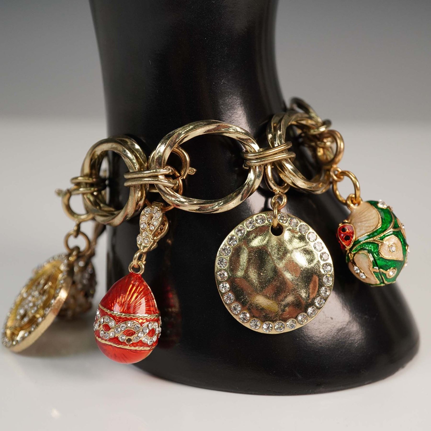 This bold goldtone charm bracelet features oversized interlocking links and five dangling charms in the shape of stylized Faberge-style eggs and medallions. Each charm is richly detailed with enamel and sparkling rhinestones in colors including red, green, and pearlized white. The bracelet secures with a lobster clasp and measures approximately 8.75"L clasp to clasp. A playful and elegant costume jewelry statement piece with vintage appeal.