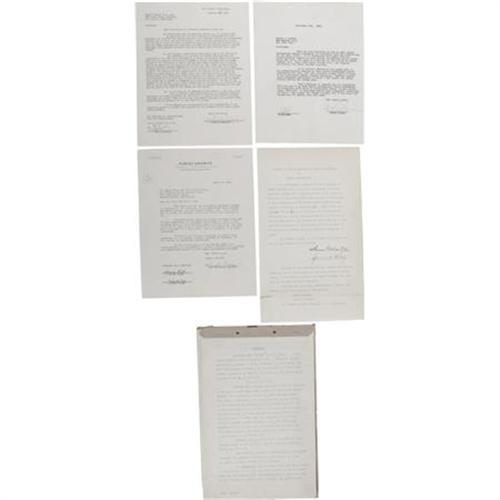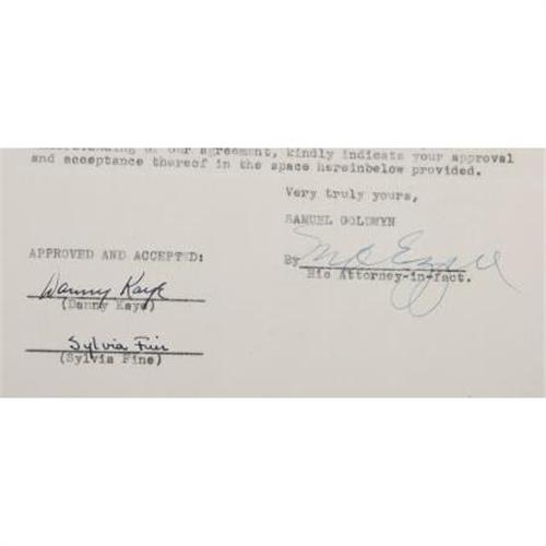 <B>Samuel Goldwyn, David Niven, Broderick Crawford, and Danny Kaye Signed Documents.</B></I> Includes a page of typed meeting minutes, dated September 15, 1936, and signed by Samuel Goldwyn; a letter of agreement dated September 9, 1939 and signed by David Niven; a one-page agreement dated December 4, 1936 and signed by Broderick Crawford; a one-page letter of agreement on Samuel Goldwyn letterhead, dated April 5, 1944, signed by Danny Kaye and Sylvia Fine; and a 26-page contract dated July 31, 1951, signed on the last page by Kaye and Fine. Items are in overall Fine to Very Fine condition with some instances of mild to moderate creasing, wear, and toning.<BR><BR><b>Shipping:</b> Flat Material, Small (<a target="_blank" href="http://www.heritageauctions.com/common/shipping.php">view shipping information</a>)