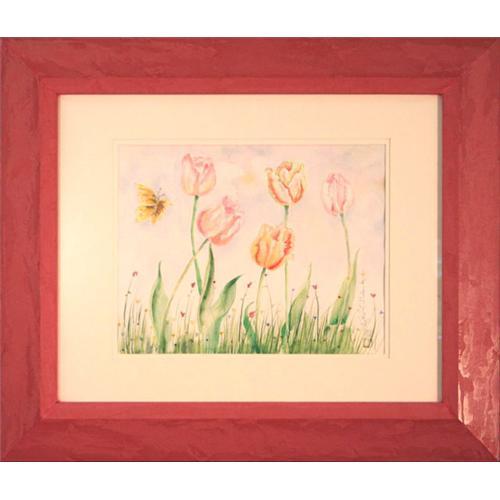 A yellow butterfly approaches the nectar of the wavering tulips in this fanciful watercolor landscape by the talented Phyliss Golec. Each tulip bends with the wind, revealing their intricately painted petals in alternating shades of pink and orange. Tiny buds among the grass reach upward and dot the foreground with wonderful bursts of color. The pale blue sky contrasts the brightness of the flowers and their beauty as well as the flight of the butterfly to take center stage. A simple double mat of ivory color surrounds the painting and serves to accentuate the dark Terra Cotta textured wood which pulls the color of the tulips out from the center of the piece. Including the frame, this piece measures 25 ¼ ? x 21 ½ ?. Phyliss Golec has signed the work along the bottom left side. This original painting is in wonderful condition and would be an excellent buy for anyone who anxiously awaits the arrival of spring and enjoys the wonderful moments it brings.