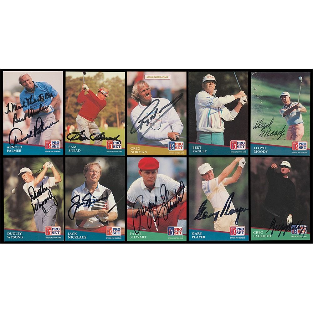 Complete set (285/285) of 1991 Pro Set PGA Tour golf trading cards, signed by each pictured golfer with the exception of three cards—Nos. 10 (Craig Rudolph), 196 (Gardner Dickinson), and 228 (George Lanning). Highlights include: Arnold Palmer (ins), Jack Nicklaus, Sam Snead, Gary Player, Payne Stewart, Bert Yancey, Greg Ladehoff, Greg Norman, Dudley Wysong, and Lloyd Moody. In overall fine condition.