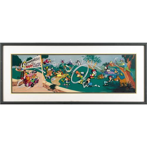 <B>"Golf-A-Rama" Limited Edition Hand Painted Cel #20/200 Original Art (Walter Lantz Productions, 1992).</B></I> This triple panning cel features sixteen of Walter Lantz's most recognizable characters. The beautiful gouache background is reproduced by lithography on acid free material. This is number 20 from the regular limited edition of 200 hand painted cels personally signed by Walter Lantz. The image area measures 38" x 11.5". The work is framed and in Excellent condition. Includes a certificate of authenticity.