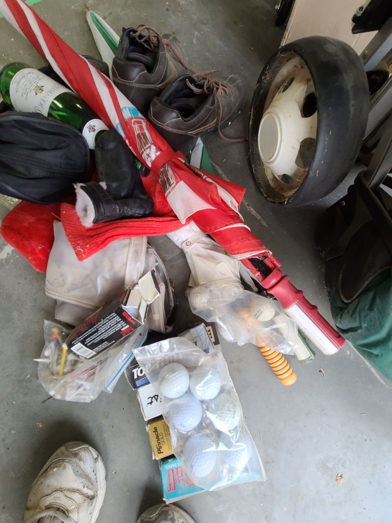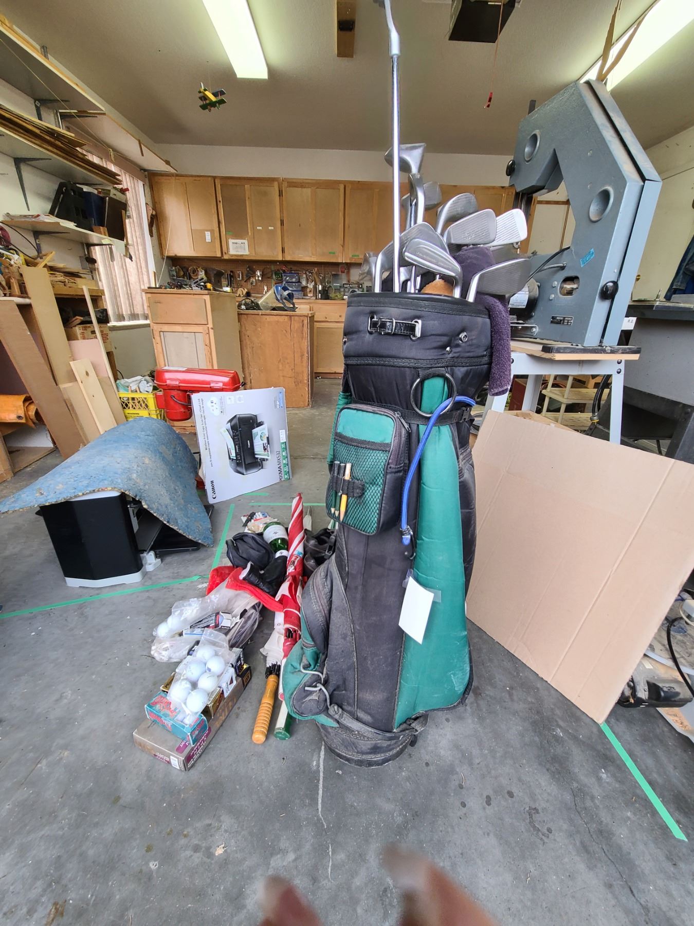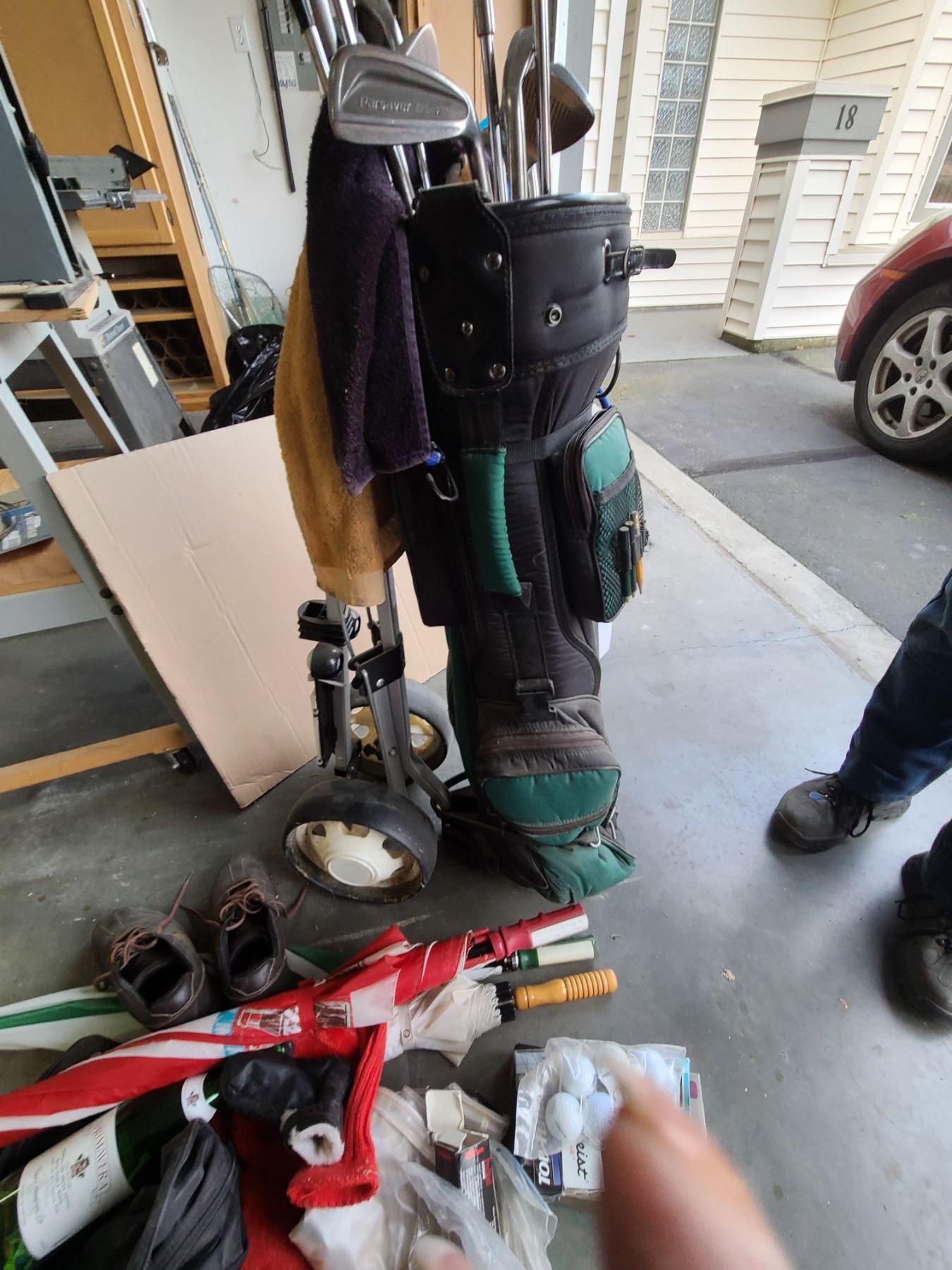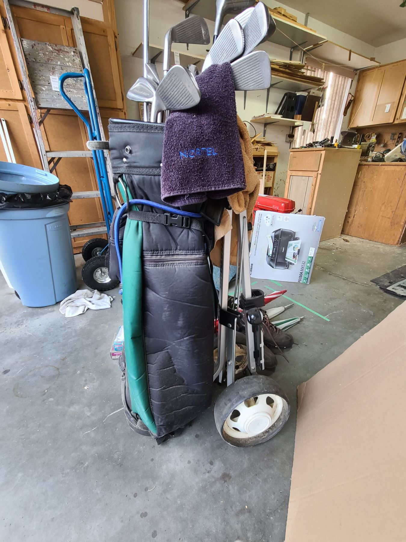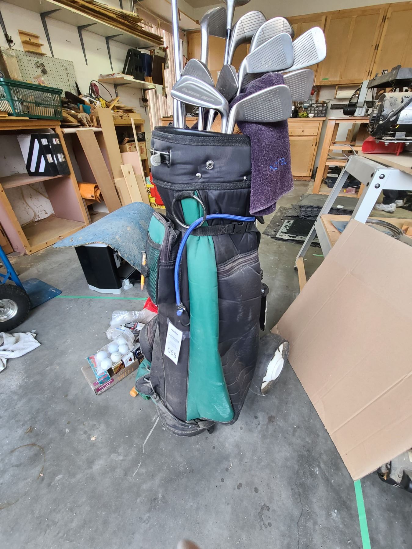 Golf bag with 14 clubs and assorted golf items. Pickup at 9 am.