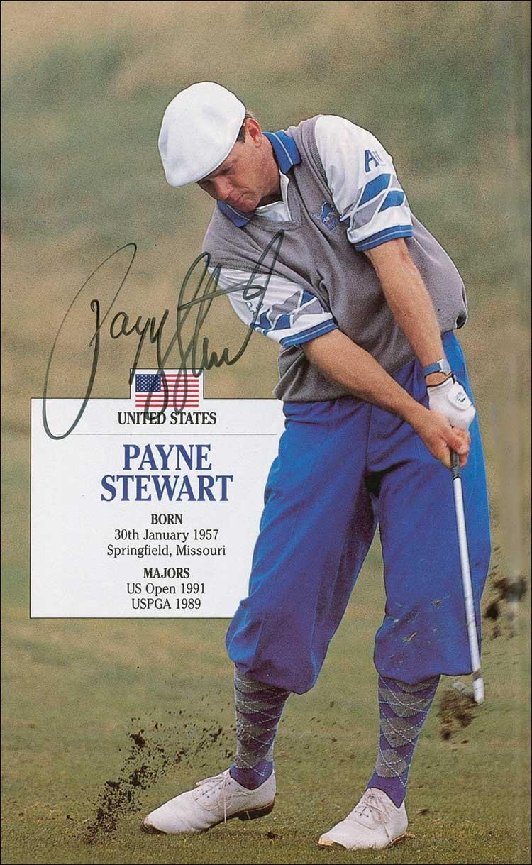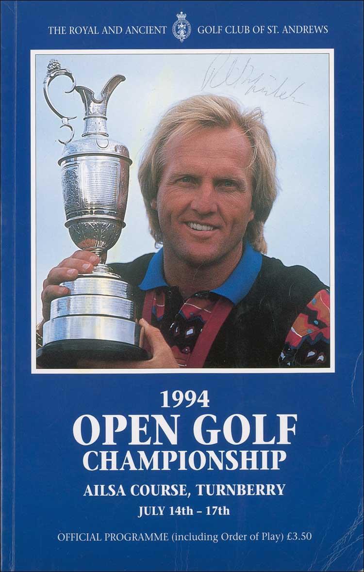 Program from the 1994 British Open, 6 x 9.5, 152 pages, signed on the cover and inside in ballpoint and felt tip by 12 participants, including: Payne Stewart, Jack Nicklaus, Ian Woosnam, Colin Montgomery, Phil Mickelson, Tom Kite, and John Daly. Mild overall handling wear, and some creasing to front cover, otherwise fine condition. Pre-certified Steve Grad/PSA/DNA and RRAuction COA.