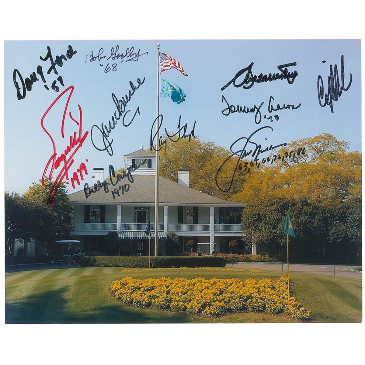 Color glossy 10 x 8 photo of the Clubhouse in Augusta, signed in felt tip by Doug Ford, Bob Goalby, Fuzzy Zoeller, Jack Burke, Billy Casper, Jack Nicklaus, Tommy Aaron, Ray Floyd, Seve Ballesteros, and Craig Stadler. In fine condition, with a bit of trivial creasing along the top and bottom edge, and some light brushing to some of the signatures.