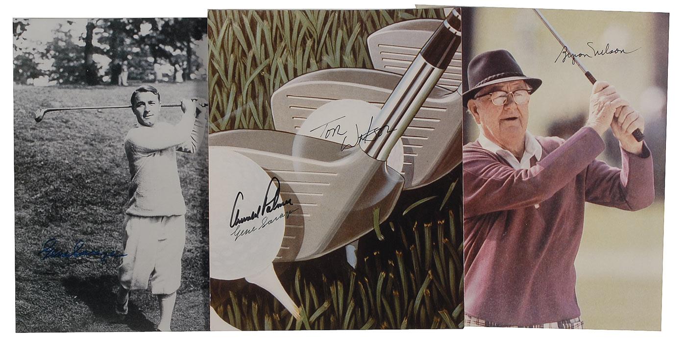 Color glossy 8 x 10 photo of an artist’s rendition of a golf club, signed in felt tip by Arnold Palmer, Gene Sarazen, and Tom Watson; a glossy 8 x 10 photo of Gene Sarazen, signed in blue felt tip; and a color glossy 8 x 10 photo of Byron Nelson, signed in black felt tip. In fine condition.