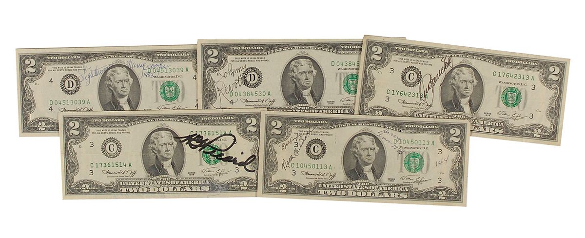 Five two-dollar bills, each signed on the portrait side by different golf greats. Signers are: Henry Picard, Johnny Revolta, ‘Lighthorse’ Harry Cooper, Ralph Guldahl, and one other. In fine condition, with vertical folds to each bill.