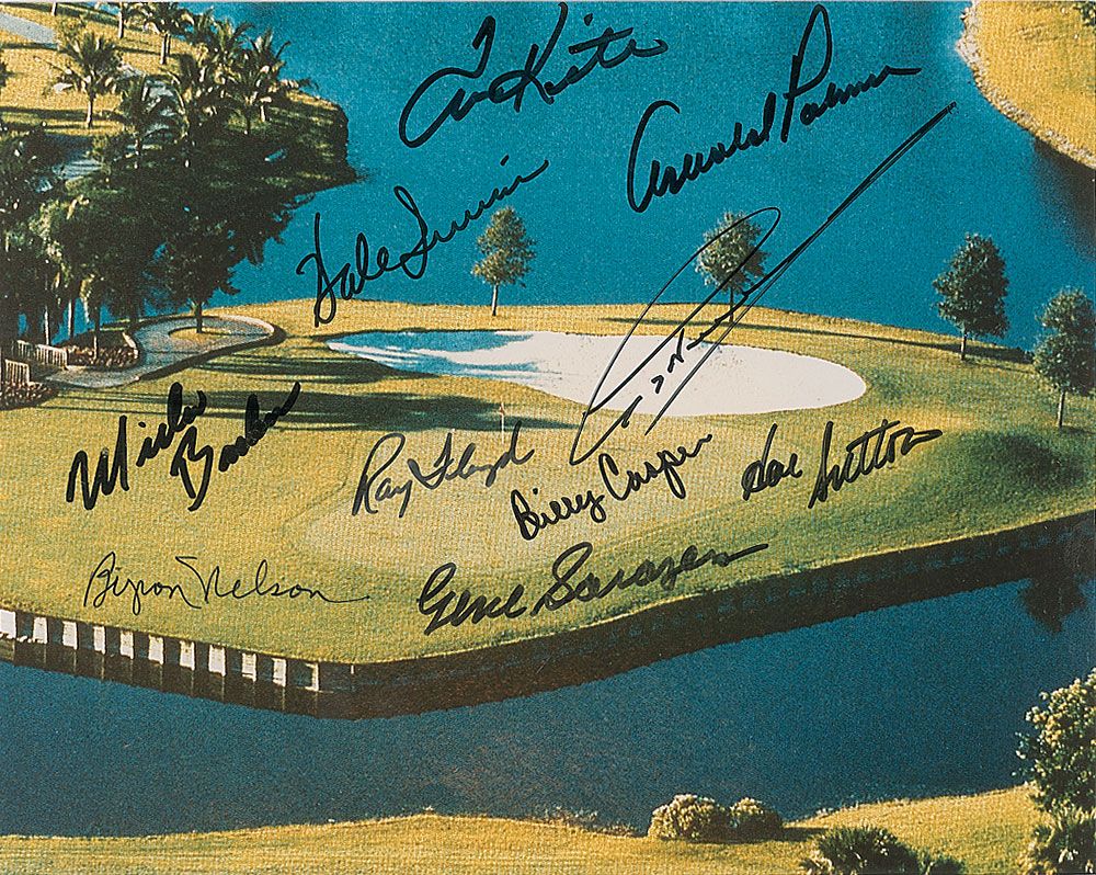 Color glossy 10 x 8 photo of an island green, signed in black felt tip by 10 greats: Byron Nelson, Gene Sarazen, Arnold Palmer, Tom Kite, Hale Irwin, Miller Barber, Ray Floyd, Billy Casper, Hal Sutton, and Greg Norman. In very fine condition.