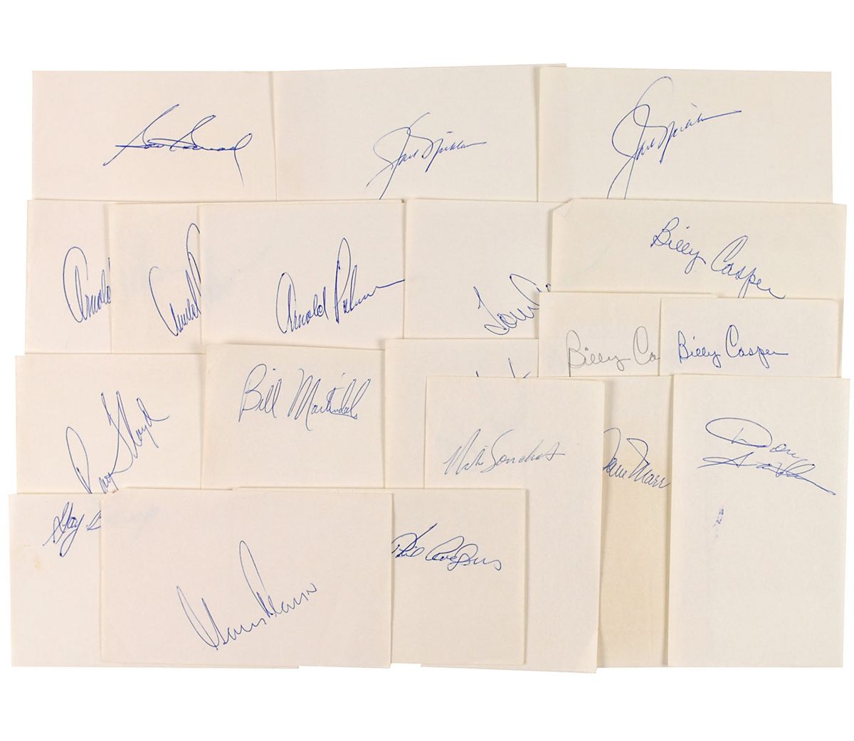 Nineteen ballpoint signatures of golf legends on individual 5 x 3 sheets. Signers are: Jack Nicklaus (2), Arnold Palmer (3), Sam Snead, Billy Casper (3, one pencil), Tommy Aaron, Ray Floyd, Billy Martindale, Dave Marr, Gay Brewer, Gary Player, and four others. In overall fine condition.
