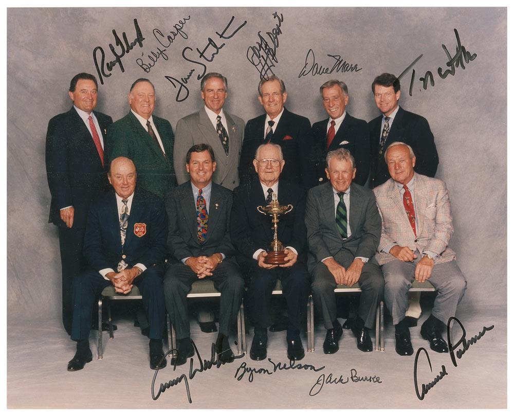 Color satin-finish 10 x 8 photo of 11 former Ryder Cup captains, signed in black felt tip by ten including Byron Nelson, Arnold Palmer, Tom Watson, Ray Floyd, Lanny Wadkins, Jack Burke, Dave Marr, and Billy Casper. In fine condition, with some light streaking to emulsion.