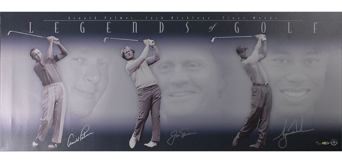 Eye-catching limited edition 44 x 18 canvas print entitled ‘Legends of Golf,’ numbered 52/150, signed in silver ink by Jack Nicklaus, Arnold Palmer, and Tiger Woods. Print is stretched over a wooden frame. In very fine condition. Accompanied by a certificate of authenticity from Upper Deck.