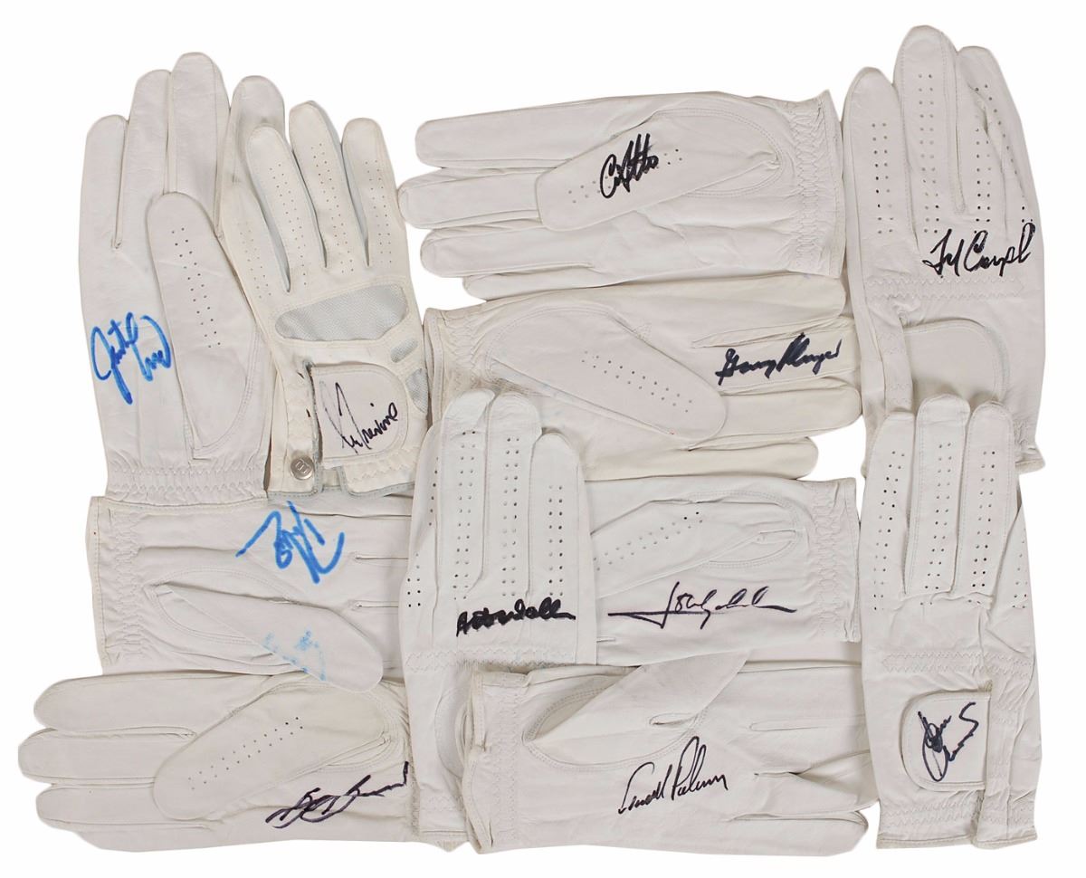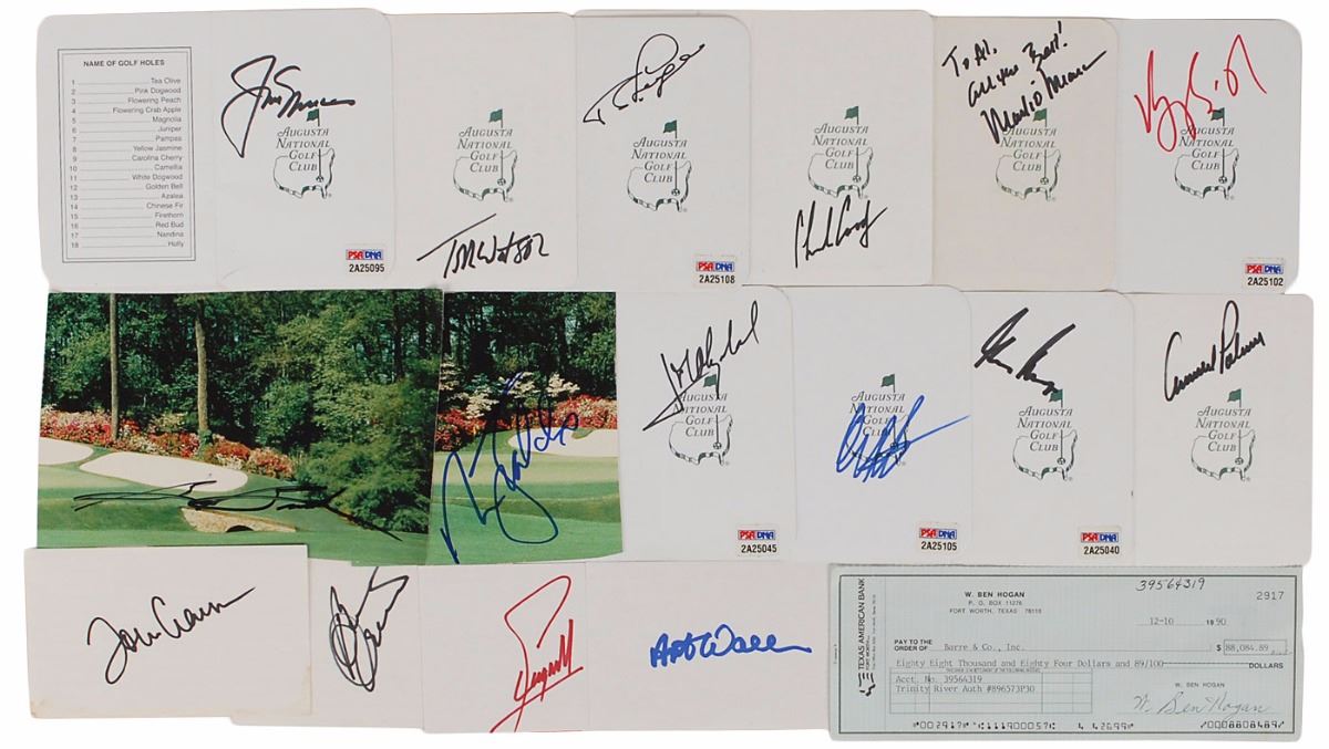 Uncommon collection of twenty-nine items signed by various golfing legends, including: a set of eleven white leather gloves, left and right-handed, sizes L and XL, individually signed in black or blue felt tip by Arnold Palmer, Gary Player, Lee Trevino, Justin Leonard, David Duval, Craig Stadler, Art Wall, Jr., Ben Crenshaw, Sam Snead, Fred Couples, and Jose Maria Olazabal; a personal check signed “W. Ben Hogan,” dated December 10, 1990; a set of sixteen signatures, consisting mostly of Masters score cards, individually signed in felt tip by Jack Nicklaus, Palmer, Player, Stadler, Wall, Olazabal, Vijay Singh (card), Ben Crenshaw (card), Mark O’Meara, Charles Coody, Tom Watson, Nick Faldo (clipped photo), Snead (clipped photo), Tommy Aaron (card), Fuzzy Zoeller, and one other; and a Masters Championship flag banner, 28.25 x 41.25, signed in black felt tip by Mike Weir and in red felt tip by Singh. Also includes a yellow 17.25 x 13 flag from the 2002 Masters. In overall very good to fine condition, with yellowing to some of the felt tip signatures on the gloves. Accompanied by a full letter and two certificates of authenticity from PSA/DNA.
