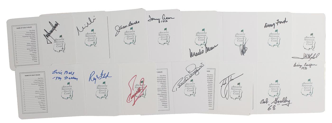 Fifteen Augusta National Golf Club scorecards, measuring 6.5 x 5 opened, 14 signed on either side in felt tip by a former Masters champion. Signers are: Ray Floyd, Fuzzy Zoeller, Bernhard Langer, Zach Johnson, Bob Goalby, Billy Casper, Trevor Immelman, Mike Weir, Jack Burke, Tommy Aaron, Mark O’Meara, Doug Ford, Jose Maria Olazabel, and Craig Stadler. Final card is signed by Errie Ball, the last remaining golfer who played in the 1934 original Masters. In fine condition.