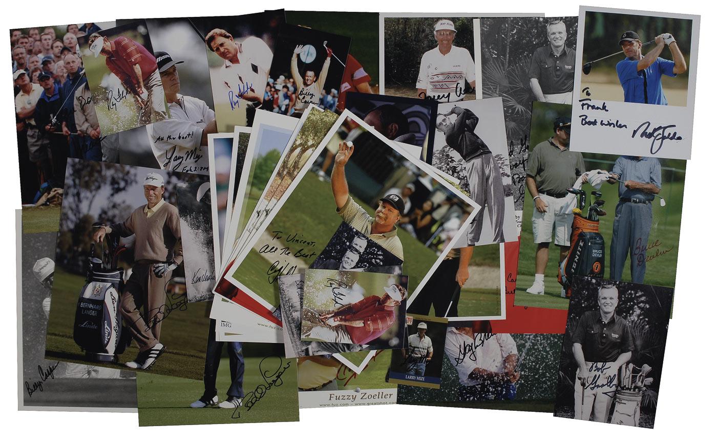 Thirty-seven signed photos, ranging in size from 4 x 6 up to 8 x 10, including 25 color, each signed in felt tip by the respective Masters champion pictured. Signers are: Ken Venturi (2), Doug Ford, Don Finsterwald, Larry Mize (2, one trading card), Ray Floyd (3), Billy Casper (2), Mark O’Meara (3), Seve Ballesteros, Nick Faldo (ins), Bernhard Langer (3), Tommy Aaron (2), Bruce Devlin, Gay Brewer, Fuzzy Zoeller (4), Tom Weiskopf (ins), Billy Casper (three inscribed), Craig Stadler (2 ins), and Bob Goalby (3). In fine overall condition. RRAuction COA.
