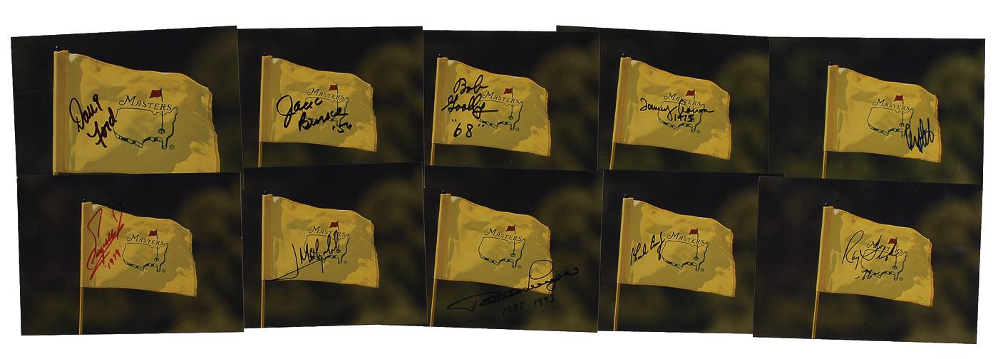 Ten identical color glossy 7 x 5 photos of a Masters hole flag, each signed in felt tip by a former Masters champion. Signers are: Fuzzy Zoeller, Bernhard Langer, Craig Stadler, Tommy Aaron, Bob Goalby, Doug Ford, Ray Floyd, Charles Coody, Jose Maria Olazabel, and Jack Burke. In very fine condition. RRAuction COA.