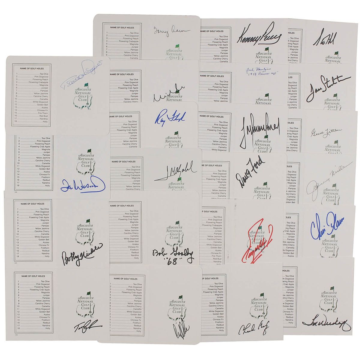 Twenty-two Augusta National Golf Club scorecards, measuring 6.5 x 4.75 opened, each signed on the front in felt tip or ballpoint by a different Masters champion or runner-up. Signers are: Charles Coody, Ray Floyd, Jose Maria Olazabal, Mike Weir, Tommy Aaron, Craig Stadler, Bob Goalby, Bernhard Langer, Fuzzy Zoeller, Doug Ford, Ian Woosnam, Trevor Immelman, Tom Lehman, Fred Hawkins, Bobby Nichols, Kenny Perry, Tom Weiskopf, Chris Dimarco, Scott Hoch, Gene Littler, Johnny Miller, and Dave Stockton. In overall fine condition.
