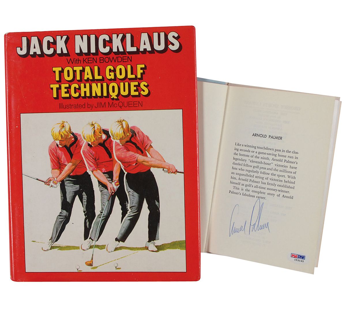 Two books: one 1967 hardcover edition of Arnold Palmer, 5.25 x 7.75, signed on the first page in blue ballpoint by Palmer; and one 1975 edition of Total Golf Techniques, hardcover with dust jacket, 8.25 x 11.25, signed and inscribed on the first free end page in black felt tip, “To Peter, Best of Luck, Jack Nicklaus.” In overall fine condition, with a spot of soiling to the signed page in the Nicklaus book. Accompanied by a certificate of authenticity from PSA/DNA for the Palmer book.