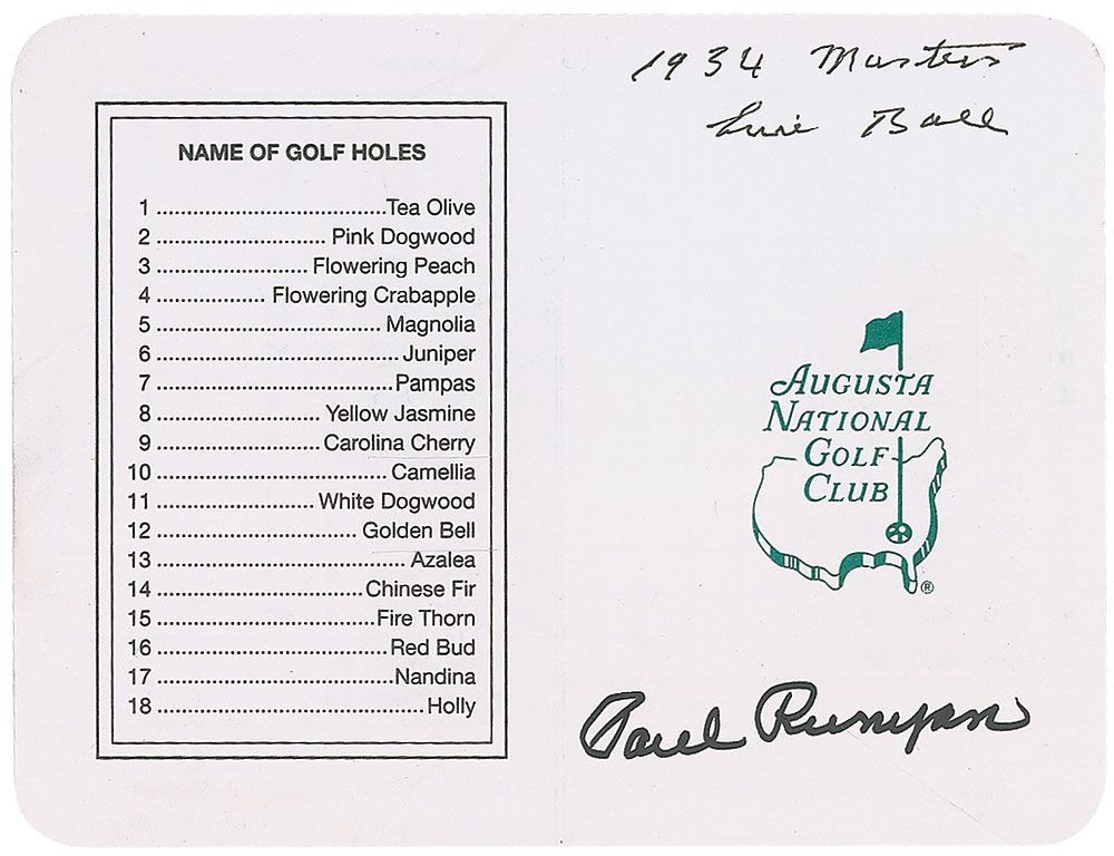 Augusta National Golf Club scorecard, measuring 6.5 x 4.75 opened, signed on the front in black ink by two participants of the first Masters held in 1934, Errie Ball and Paul Runyan. In very fine condition.