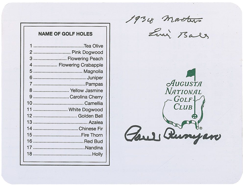 Augusta National Golf Club scorecard, measuring 6.5 x 4.75 opened, signed in ballpoint by Errie Ball and in black felt tip by Paul Runyan. In very fine condition.
