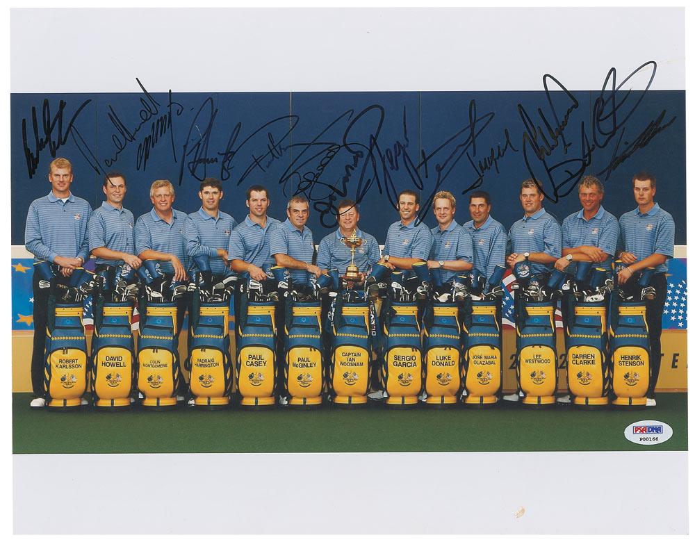 Color satin-finish 14 x 11 photo of the 2006 European Ryder Cup team, signed in black felt tip by all 13 team members pictured. Signers are: Ian Woosnam, Colin Montgomerie, Sergio Garcia, Lee Westwood, Darren Clarke, Robert Karlsson, David Howell, Luke Donald, Jose Maria Olazabel, Paul Casey, Padraig Harrington, Paul McGinley, and Henrik Stenson. Crease to top right corner, some light surface marks, spot to lower border, and a PSA/DNA authentication label affixed to bottom corner, otherwise fine condition Accompanied by a full letter of authenticity from PSA/DNA.