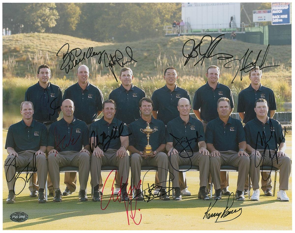 Color glossy 14 x 11 photo of the 2008 United States Ryder Cup team posing with the Ryder Cup after their victory, signed in black and red felt tip by all 13 members: Paul Azinger, Phil Mickelson, Stewart Cink, Kenny Perry, Jim Furyk, Anthony Kim, Justin Leonard, Ben Curtis, Boo Weekley, Chad Campbell, J. B. Holmes, Hunter Mahan, and Steve Stricker. In fine condition, with slight contrast to a few signatures and a PSA/DNA authentication label affixed to lower corner. Accompanied by a full letter of authenticity from PSA/DNA.