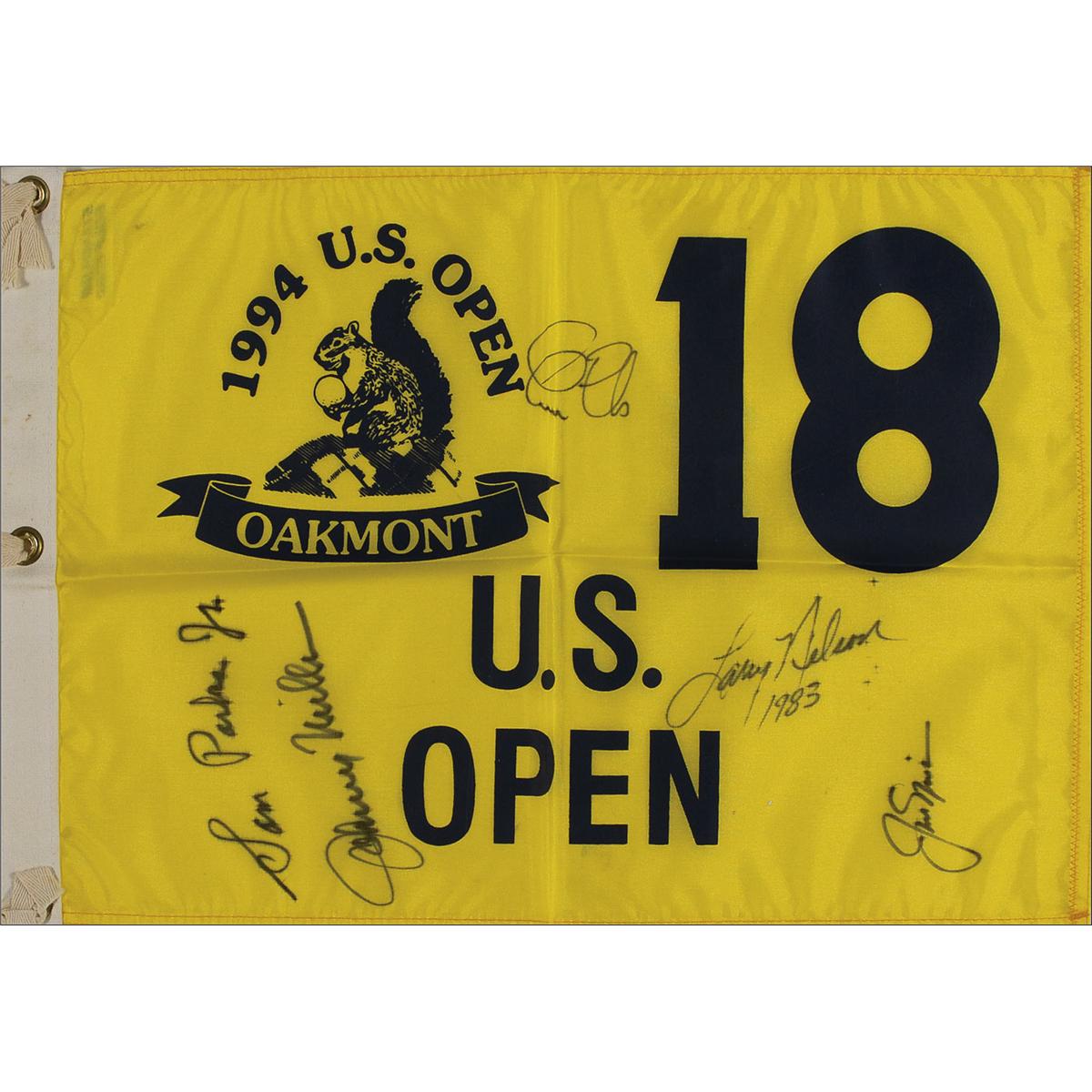 Yellow 1994 US Open Oakmont golf flag, 20.5 x 13.5, signed in black felt tip on the front by five former champions who all won the US Open at Oakmont: Jack Nicklaus, Ernie Els, Sam Parks, Jr., Johnny Miller, and Larry Nelson. In fine condition, with central vertical and horizontal storage folds and expected light feathering due to nature of material.