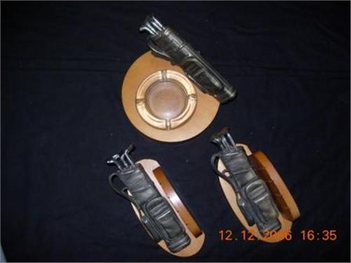 Each item has a wood base and metal golf bag with golf clubs that can be pulled out of the bag. The ashtray is about 7.5" wide and about 6" tall. The bookends are about 9" wide and about 5.25" tall.