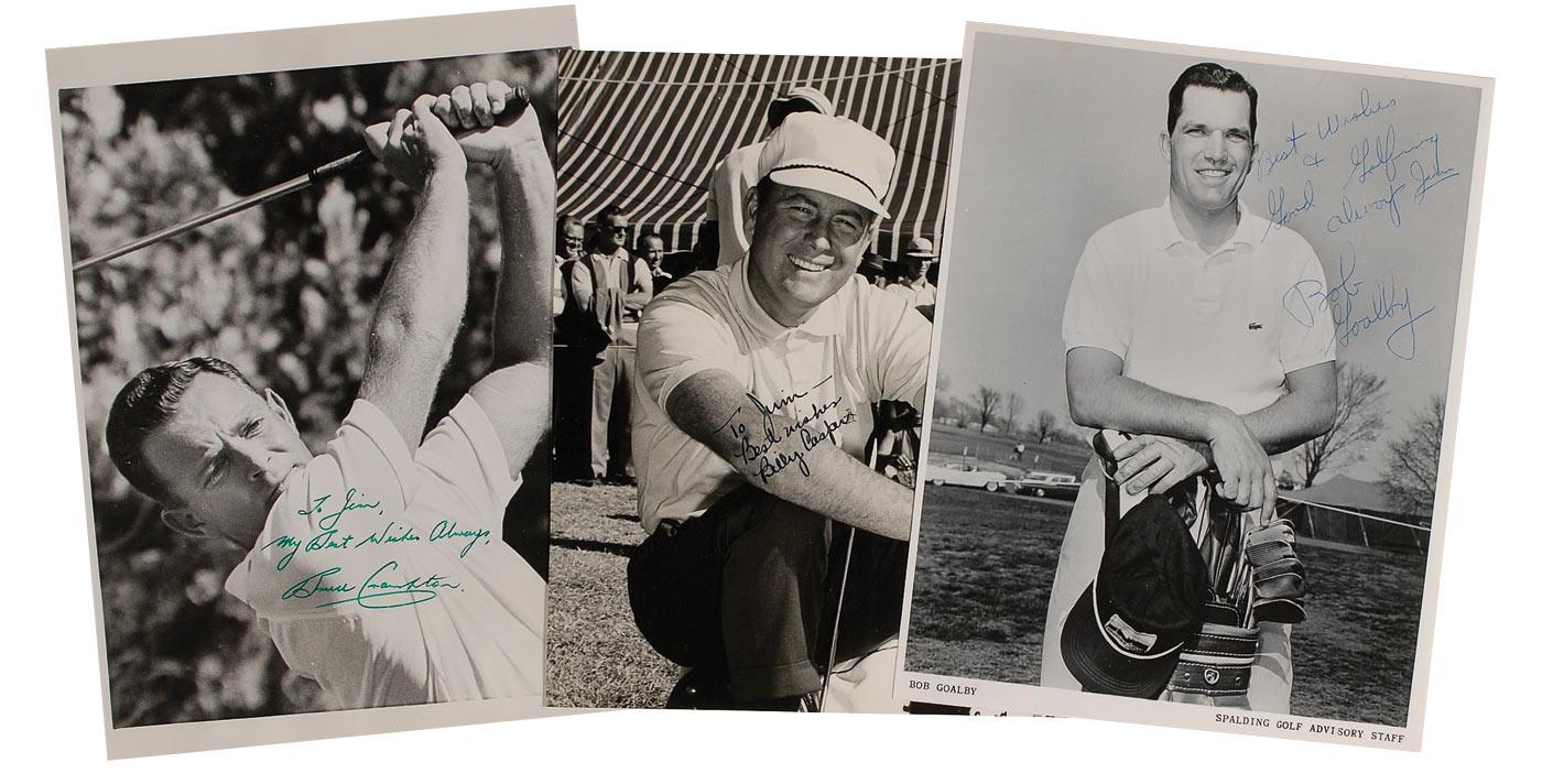 Three glossy approximately 8 x 10 photos, each signed and inscribed in ink or felt tip by the respective golfer pictured. Signers are: Billy Casper, Bob Goalby, and Bruce Compton. In overall very good to fine condition.