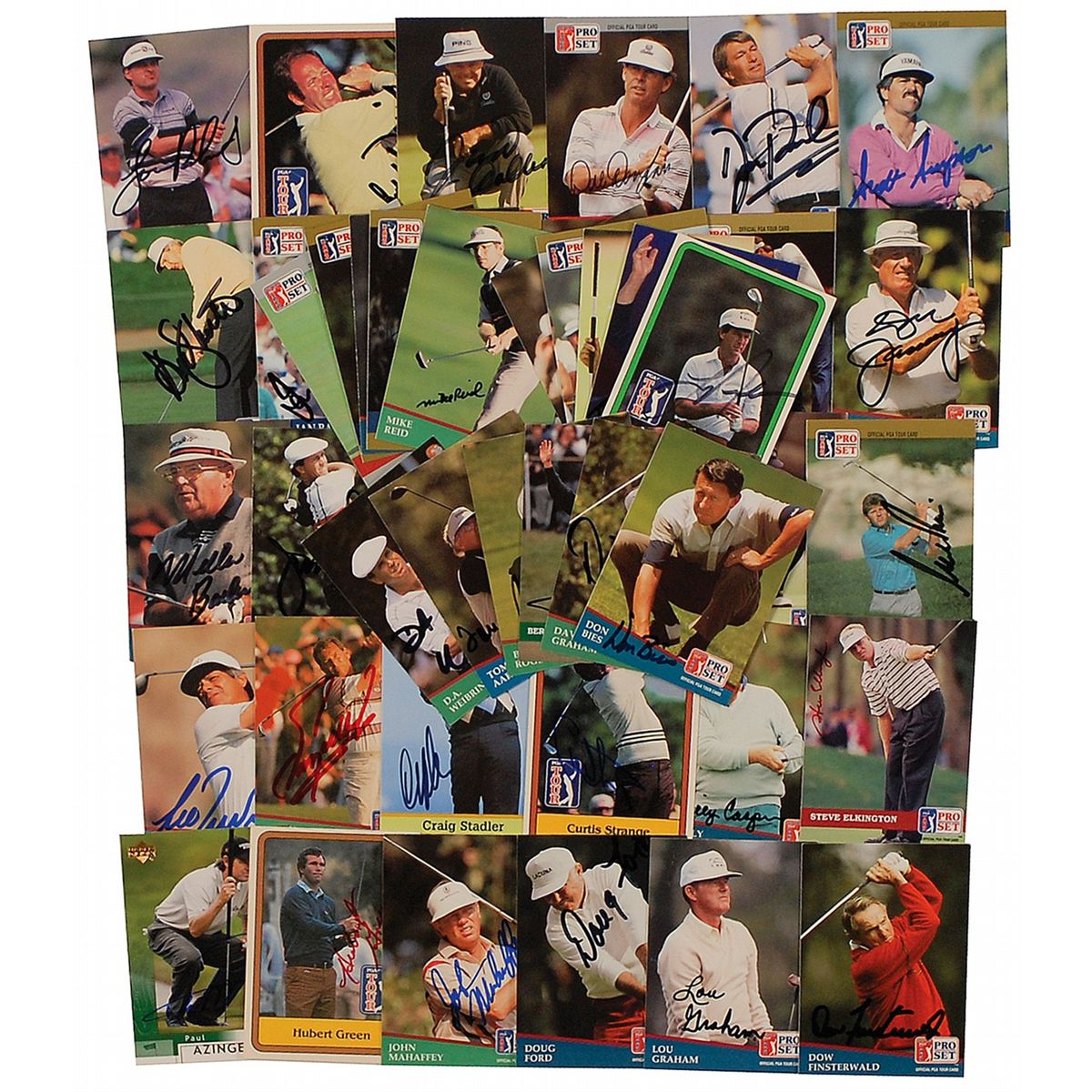 Forty-six trading cards, various years and manufacturers, each signed on the front in ink or felt tip by the respective golfer pictured. Signers are: Tommy Aaron, Paul Azinger, Ian Baker-Finch, Miller Barber, Don Bies, Mark Calcavecchia, Billy Casper, Jim Colbert, Charles Coody, Dale Douglass, Steve Elkington, Dow Finsterwald, Ray Floyd, Doug Ford, Bob Goalby, David Graham, Lou Graham, Hubert Green, Jay Haas, Peter Jacobsen, Don January, Bernhard Langer, Larry Laoretti, Gene Littler, John Mahaffey, Larry Nelson, Bobby Nichols, Andy North, Mark O’Meara, Jerry Pate, Don Pooley, Nick Price, Mike Reid, Loren Roberts, Bill Rogers, Scott Simpson, Jeff Sluman, Craig Stadler, Curtis Strange, Hal Sutton, Lee Trevino, Ken Venturi, Lanny Wadkins, D. A. Weibring, Tom Weiskopf, and Fuzzy Zoeller. In overall fine condition.