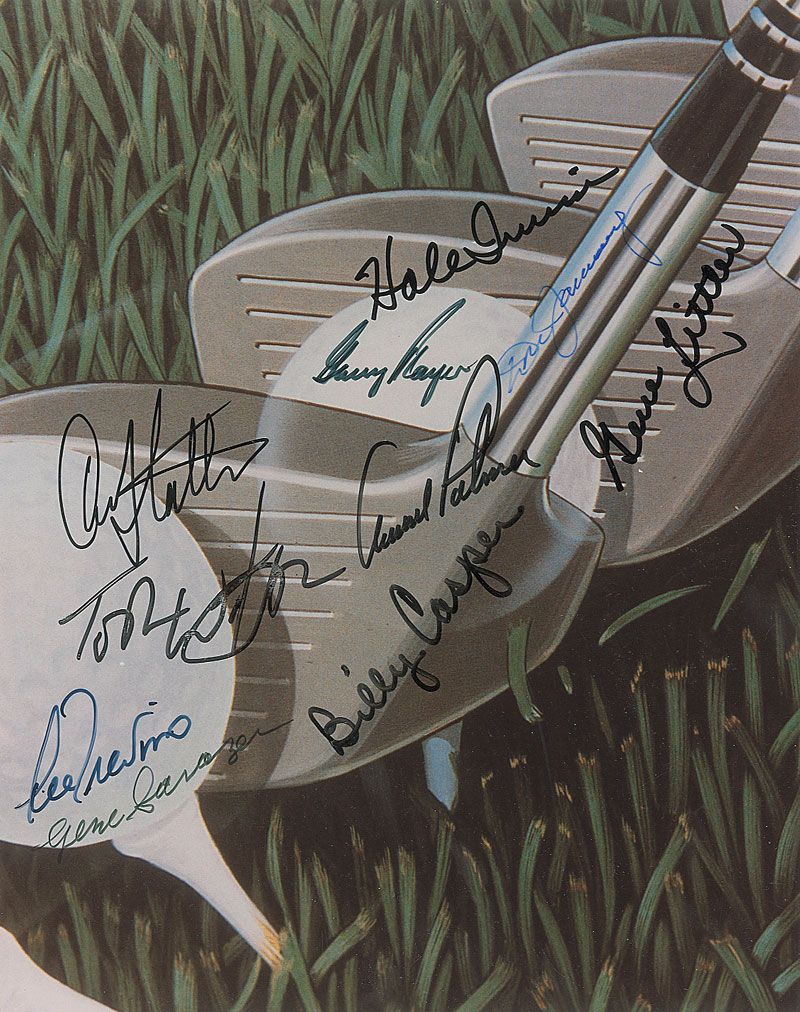 Color glossy 8 x 10 photo of an artist’s rendition of a golf club striking a ball, signed in various color felt tip by 10 greats: Arnold Palmer, Gene Sarazen, Craig Stadler, Tom Watson, Lee Trevino, Hale Irwin, Gary Player, Billy Casper, Don January, and Gene Littler. In fine condition.