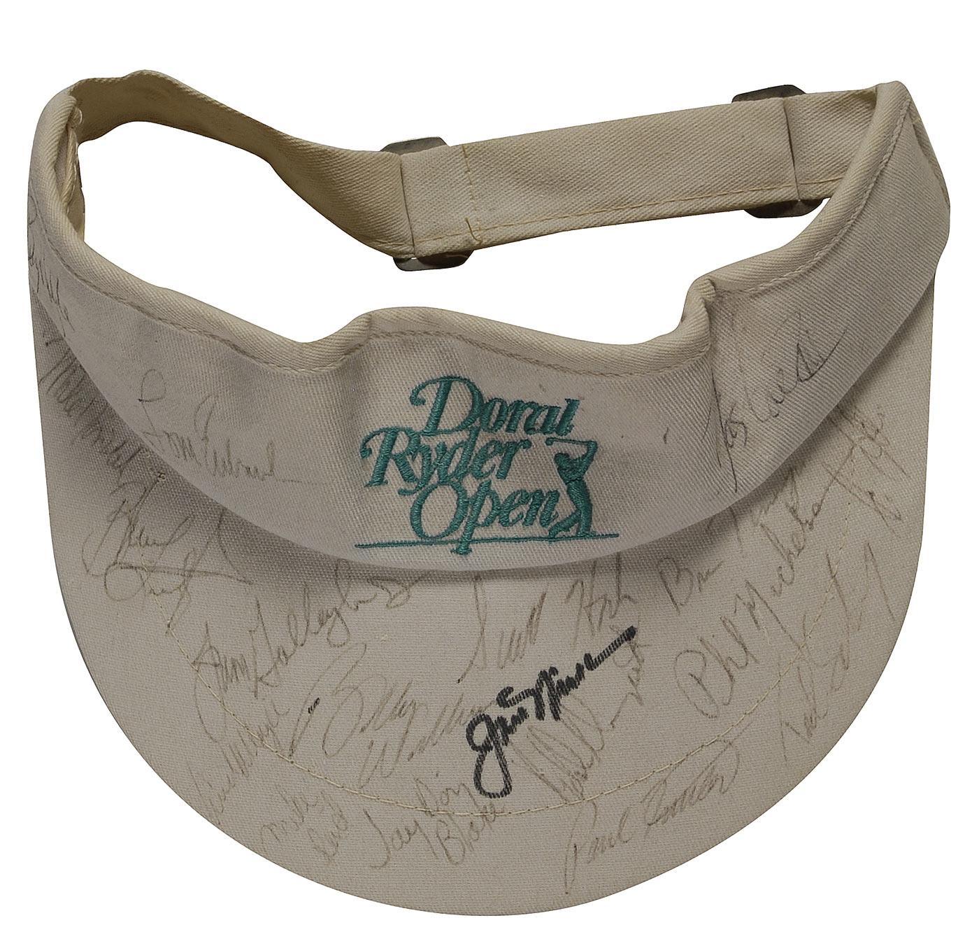 Beige golf visor from the 1991 PGA Doral Open in Miami, signed in ink and felt tip by 18 participants including Jack Nicklaus, Phil Mickelson, Jay Don Blake, Brian Tennyson, Jim Gallagher, Jr., Scott Hoch, Bobby Wadkins, Tom Eubank, and Mike Donald. Signatures were originally acquired by an event volunteer. In fine condition. Pre-certified Steve Grad/PSA/DNA and RRAuction COA.