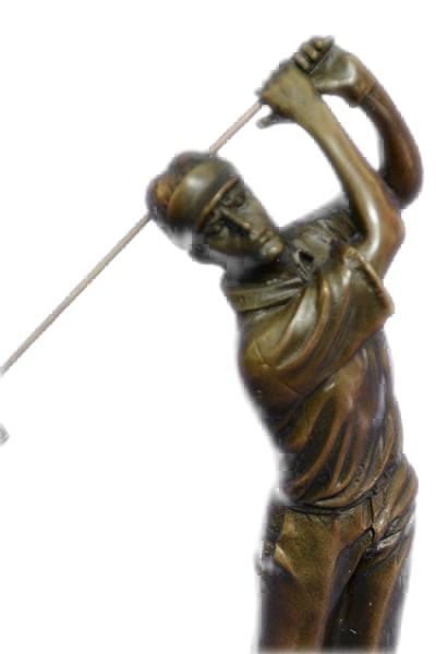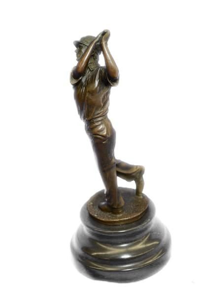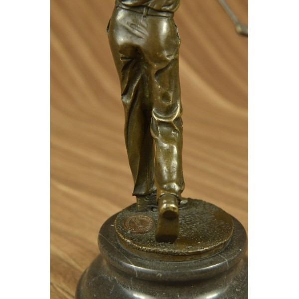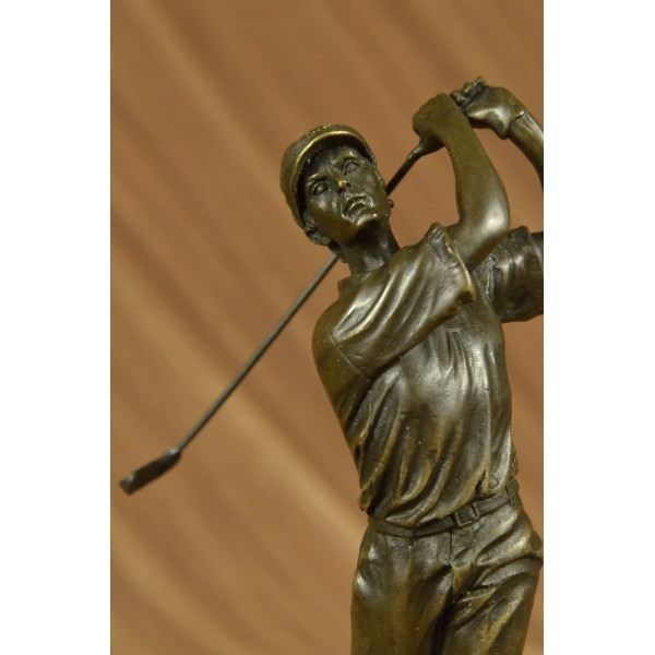 The golfer smiles as he has just completed a perfect swing. He watches as his ball sinks into the hole. This golfer is dressed sharply in polo and crisp pants. His outfit is topped off with cap. This sculpture is a wonderful gift for a golf lover! It will surely delight any enthusiast of the sport. The piece was made using the lost wax method and it rests on a marble base. Bronze Dimensions with Marble Base: Height 10 X Width 5 inches. Weight: 4 LBS.
