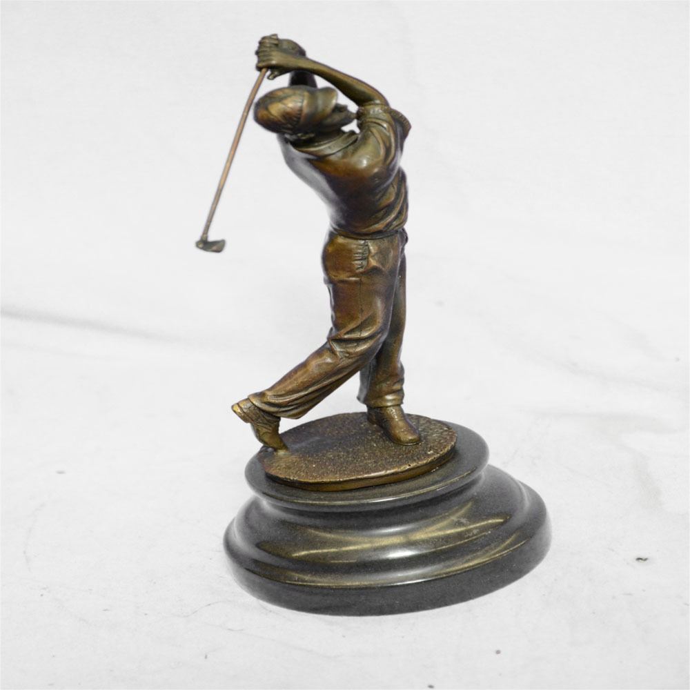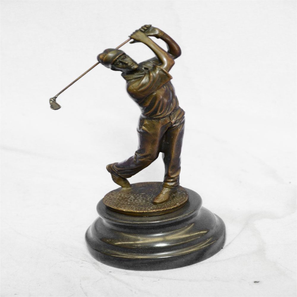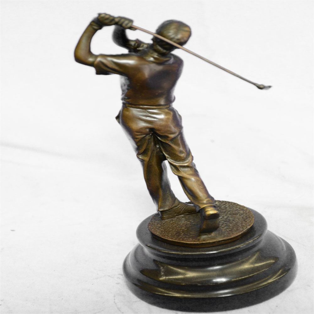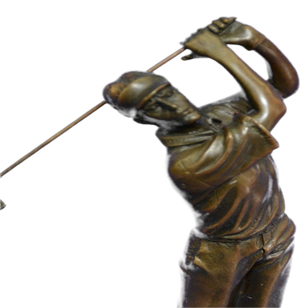 The golfer smiles as he has just completed a perfect swing. He watches as his ball sinks into the hole. This golfer is dressed sharply in polo and crisp pants. His outfit is topped off with cap. This sculpture is a wonderful gift for a golf lover! It will surely delight any enthusiast of the sport. The piece was made using the lost wax method and it rests on a marble base. Bronze Dimensions with Marble Base: Height 10 X Width 5 inches. Weight: 4 LBS.
