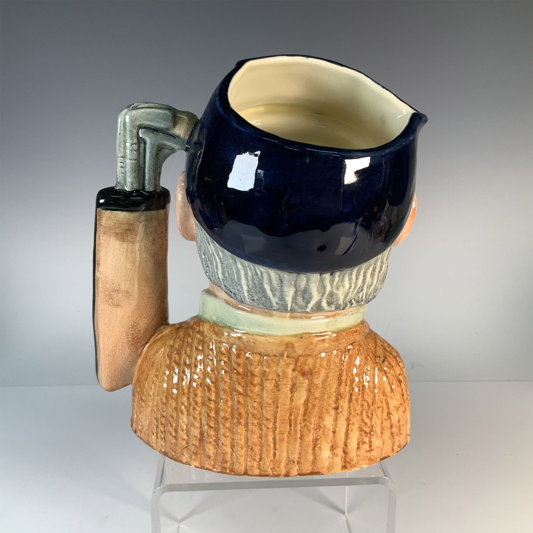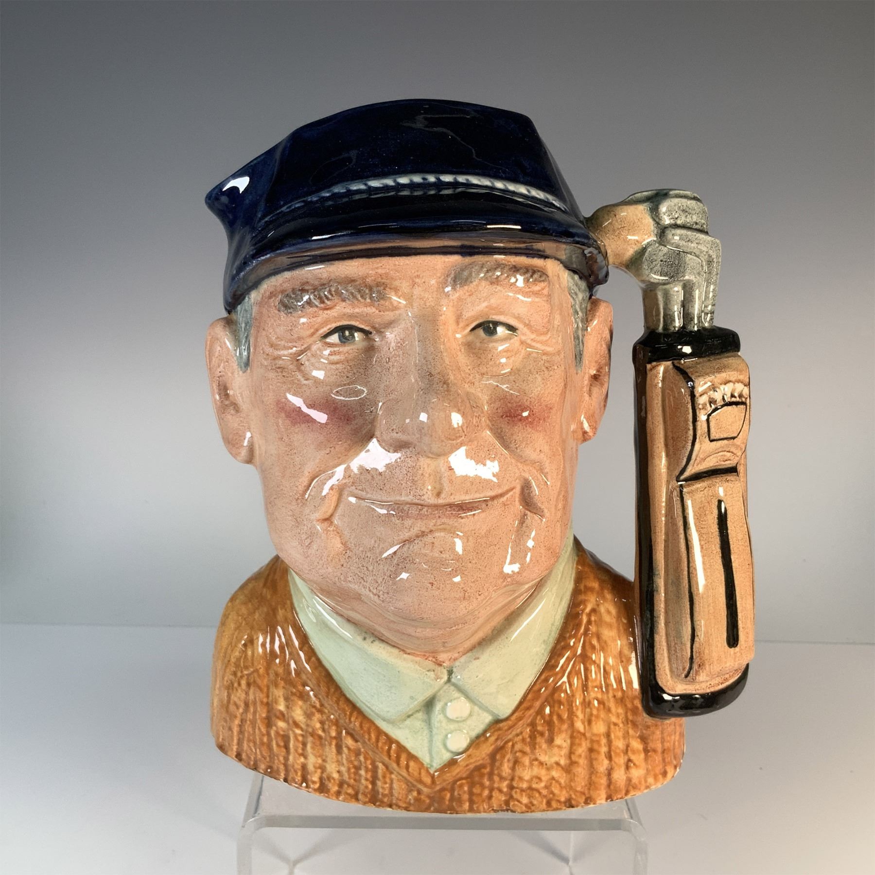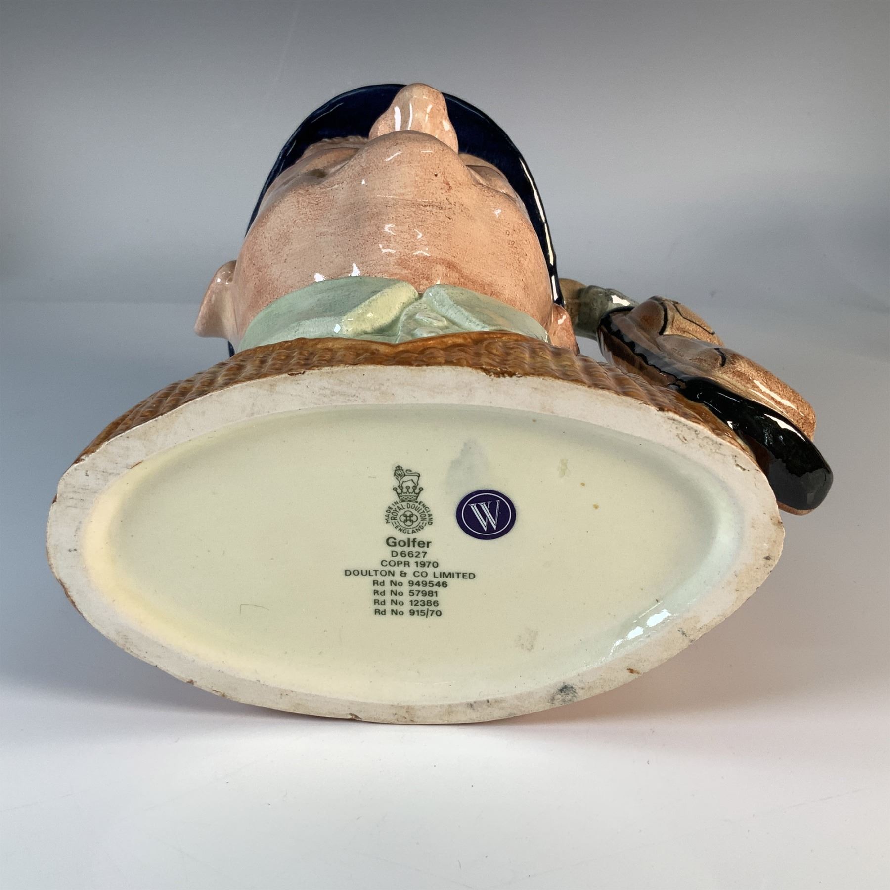 This Royal Doulton Golfer character jug was introduced in 1970 and features a finely crafted depiction of a golfer with detailed features, wearing a cap and accompanied by a golf bag. Made in England, this collectible ceramic piece is part of Royal Doulton's iconic character jug series, known for its intricate artistry and cultural significance. The underside bears the Royal Doulton backstamp along with the model number and copyright details.