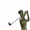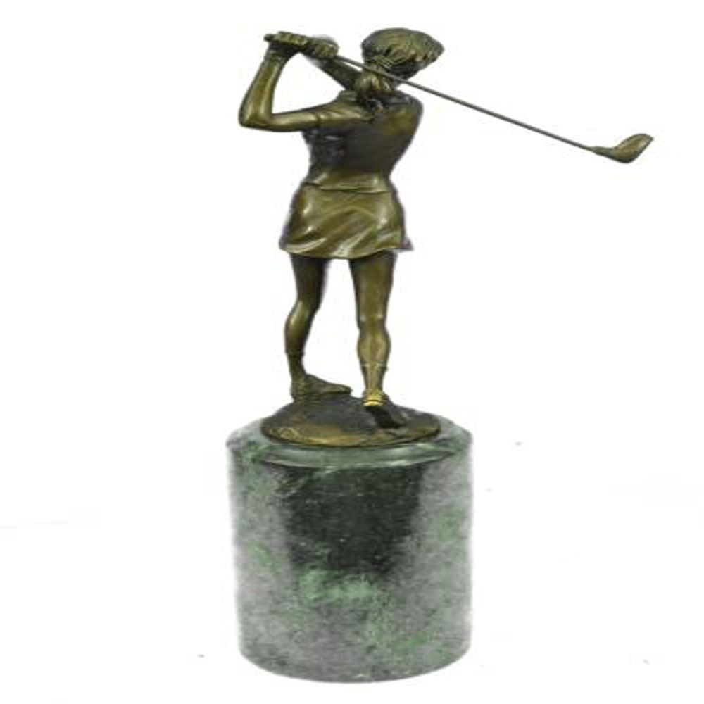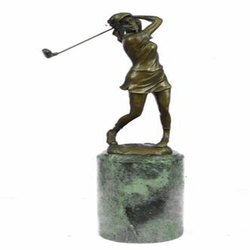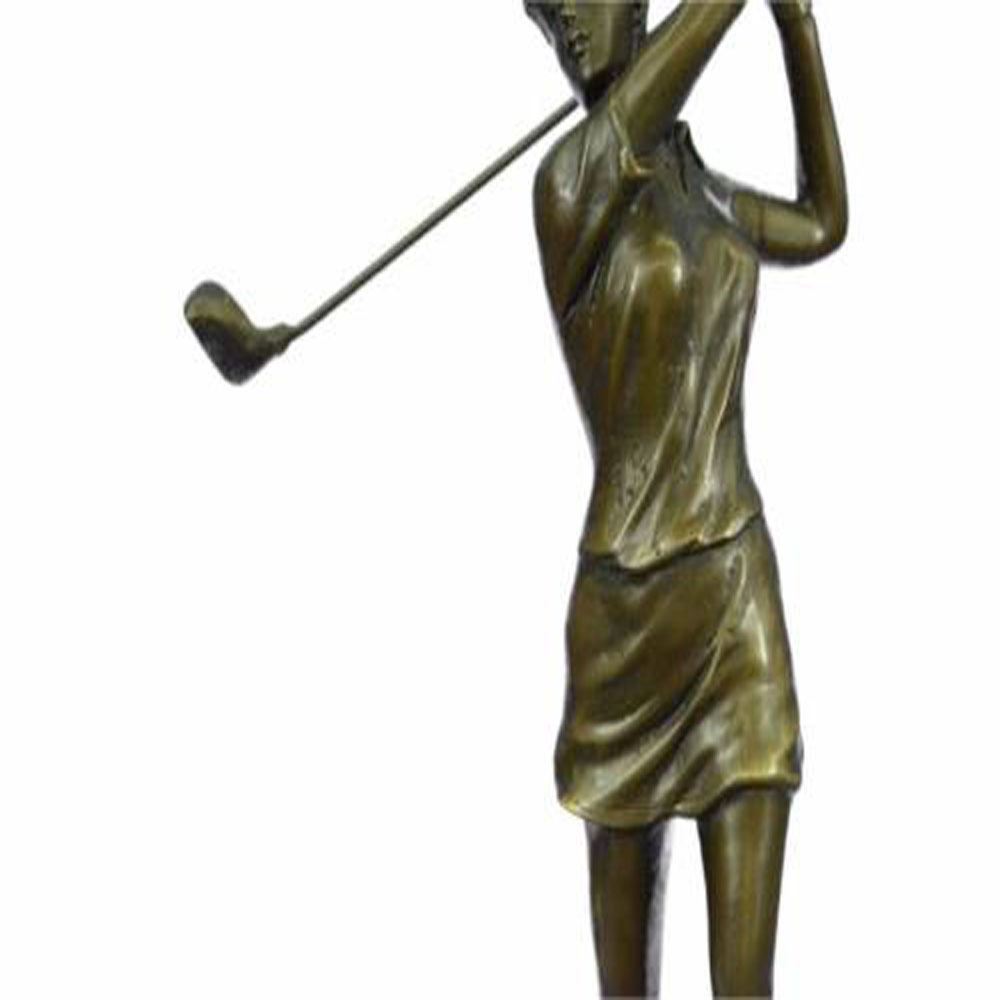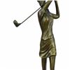 A golfer tilts her head up to the sun and watches her ball rise. She holds her form and stance, tracking the position of the ball and how close to the green it may land. Her body twists with her stroke. In her head, she counts the strokes she may need if it does not land on the green and how many she may need if it does. She silently prays that it does not land in a sand trap or near a water hazard. Though the crowd has already begun to erupt in an uproar, she knows it is too soon for celebration. The ball is left to the wind. She wears a cotton tee shirt, skirt, and cap. There are fine details to appreciate like the ripples of her moving clothes and the rough patches of the manicured grass. This handmade Bronze Sculpture was cast using the Lost Wax Method and mounted on a marble base. Dimensions: Height 13 X Width 3 inches. Weight: 7 LBS.