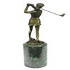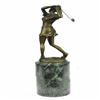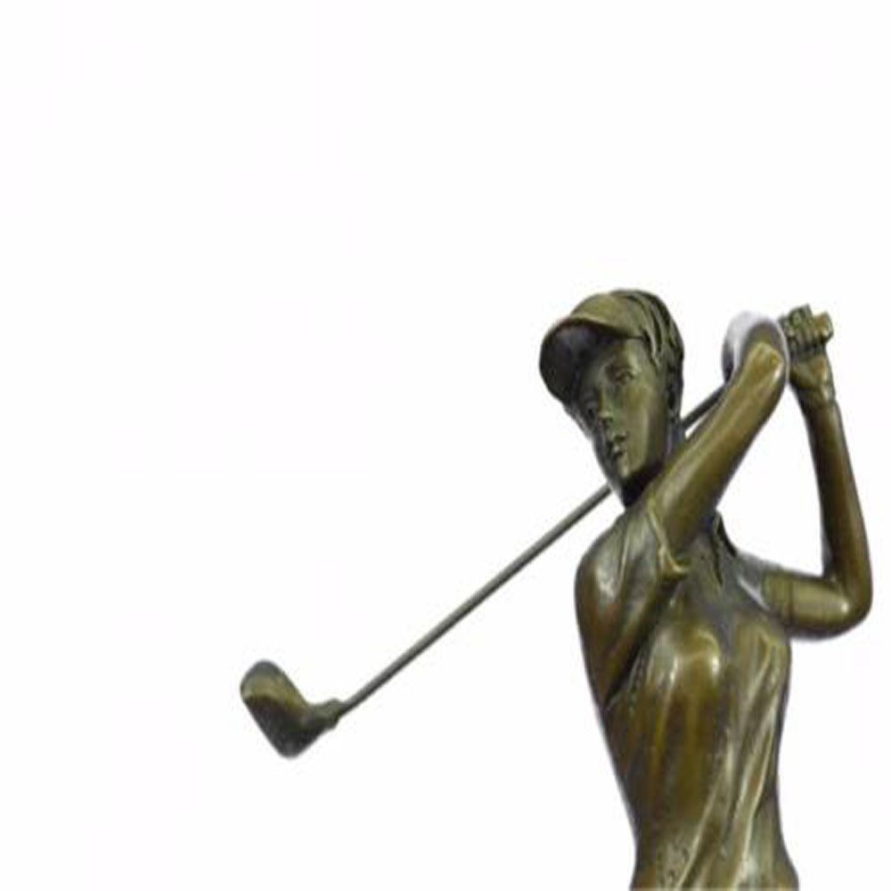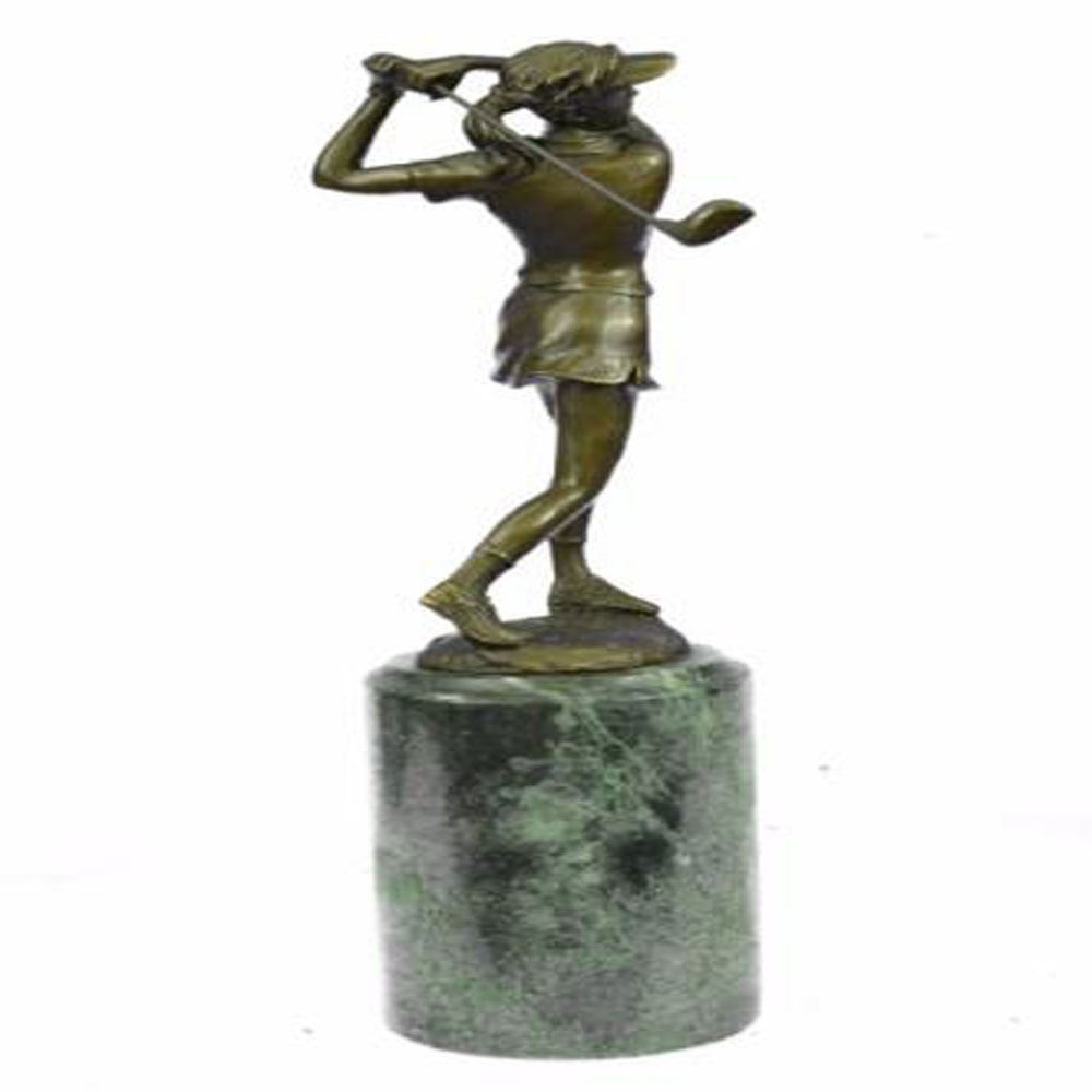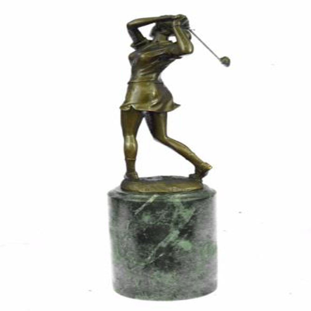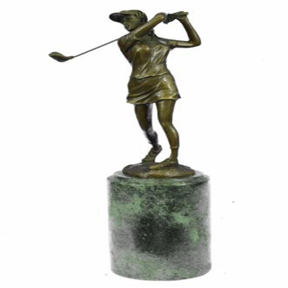 A golfer tilts her head up to the sun and watches her ball rise. She holds her form and stance, tracking the position of the ball and how close to the green it may land. Her body twists with her stroke. In her head, she counts the strokes she may need if it does not land on the green and how many she may need if it does. She silently prays that it does not land in a sand trap or near a water hazard. Though the crowd has already begun to erupt in an uproar, she knows it is too soon for celebration. The ball is left to the wind. She wears a cotton tee shirt, skirt, and cap. There are fine details to appreciate like the ripples of her moving clothes and the rough patches of the manicured grass. This handmade Bronze Sculpture was cast using the Lost Wax Method and mounted on a marble base. Dimensions: Height 13 X Width 3 inches. Weight: 7 LBS.