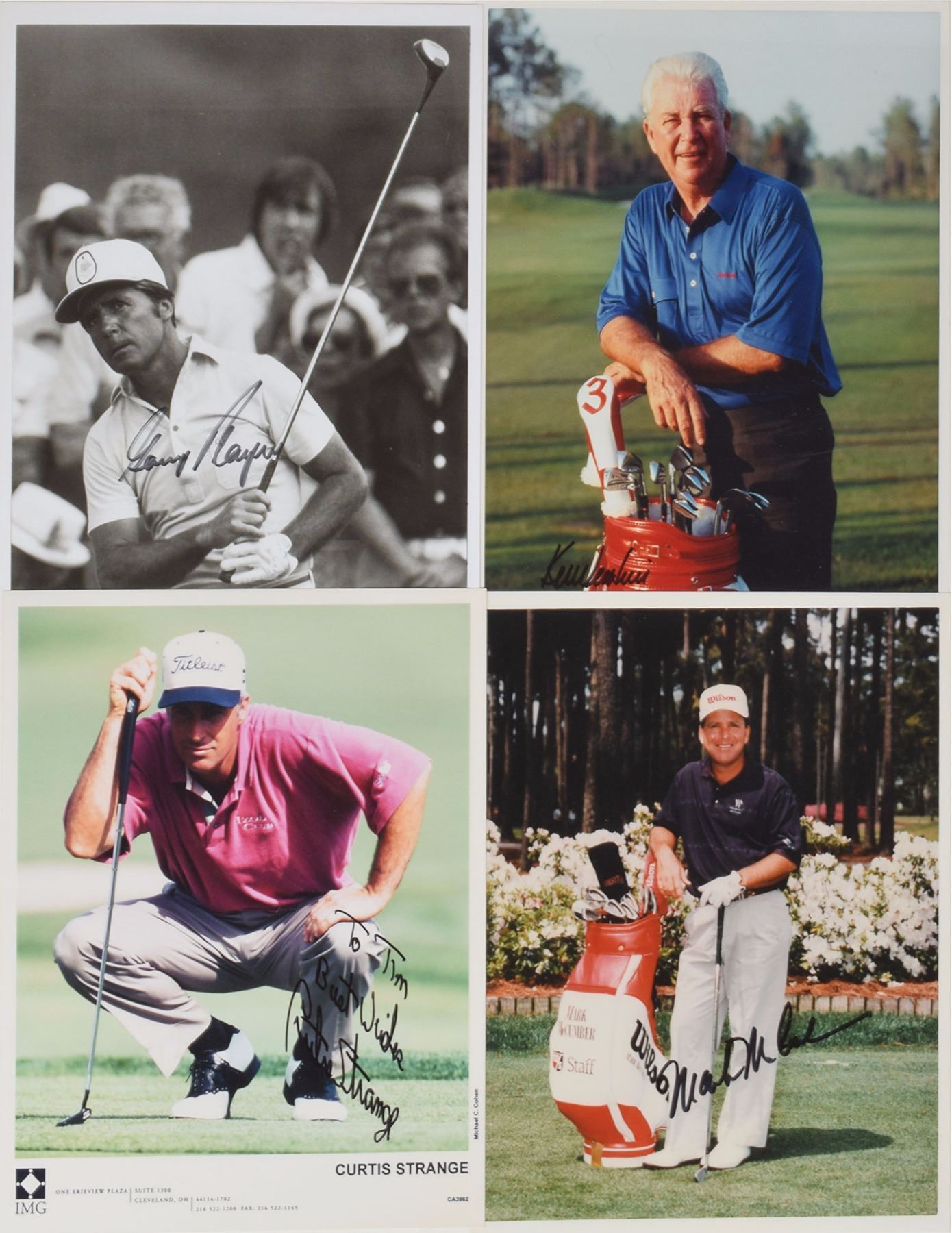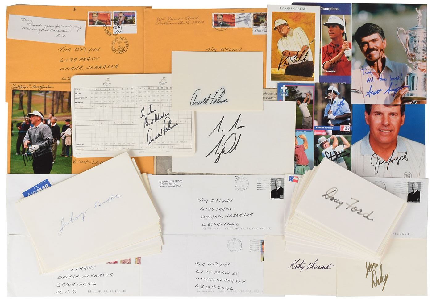 Collection of more than 100 items signed by golfing legends, consisting mostly of signed photos and signatures on off-white 6 x 4 cards, with some inscribed. Golfers include: Tommy Aaron, Amy Allott, George Archer, Seve Ballesteros, Miller Barber, Andy Bean, Frank Beard, Patty Berg, Tommy Bolt, Julius Boros, Pat Bradley, Gay Brewer, Johnny Bulla, Mark Calcavecchia, Billy Casper, Stewart Cink, Bobby Clampett (2), Harry Cooper, Ben Crenshaw, John Daly, Bruce Devlin, Bob Estes, Jack Fleck, Ray Floyd, Doug Ford, David Frost, Fred Funk, Jim Furyk, Jay Haas, Paul Harney, Tim Herron, Scott Hoch, Bob Gilder, Bob Goalby, David Graham, Lou Graham, Hubert Green (2), Scott Gutschewski, Chandler Harper (2), Hale Irwin, Tony Jacklin, Lee Janzen, Betsy King, Greg Kraft, Larry Laoretti, Tom Lehman, Justin Leonard, Gene Littler, Jeff Maggert, Don Massengale, Billy Mayfair, Mark McCumber (2), Johnny Miller, Larry Mize (2), Byron Nelson, Larry Nelson, Bobby Nichols, Greg Norman, Andy North, Arnold Palmer (2), Dottie Pepper, Gary Player (2), Betsy Rawls, Loren Roberts, Bill Rogers, Bob Rosburg, Paul Runyan, Doug Sanders, Gene Sarazen, Charlie Sifford (2), Jay Sigel (2), Scott Simpson, Jeff Sluman, J. C. Snead, Sam Snead, Craig Stadler, Dave Stockton (2), Curtis Strange, Steve Stricker, Louise Suggs, Hal Sutton, Peter Thomson, Bob Toski, Bob Tway, Ken Venturi, Scott Verplank (2), Lanny Wadkins, Art Wall, Jr., D. A. Weibring, Tom Weiskopf, Kathy Whitworth, Tiger Woods, Mickey Wright, and Fuzzy Zoeller. In overall fine condition.