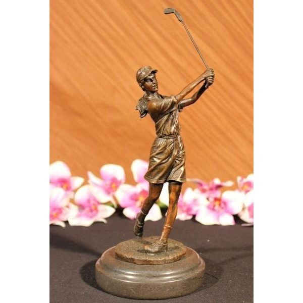 A golfer tilts her head up to the sun and watches her ball rise. She holds her form and stance, tracking the position of the ball and how close to the green it may land. Her body twists with her stroke. In her head she counts the strokes she may need if it doesn't land on the green and how many she may need if it does. She silently prays that it doesn't land in a sand trap or near a water hazard. Though the crowd has already begun to erupt in an uproar, she knows it's too soon for celebration. The ball is left to the wind. She wears a cotton tee shirt, skirt, and cap. There are fine details to appreciate like the ripples of her moving clothes and the rough patches of the manicured grass. This handmade 100% bronze sculpture was cast using the lost wax method and mounted on a marble base. Bronze dimensions with marble base: Height 12 X Width 5 inches. Weight: 5 lbs. Please Note: This is a reproduction bronze sculpture from the original molded and signed. This featured bronze sculpture is a recast after the original, and has been done recently. This 100% bronze sculpture is an abstract piece certain to be a conversation piece.Please Note: This is a reproduction bronze sculpture from the original molded and signed. This featured bronze sculpture is a recast after the original, and has been done recently. This 100% bronze sculpture is an abstract piece certain to be a conversation piece.