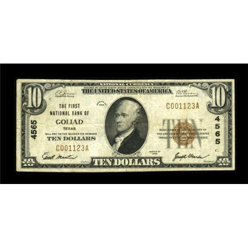 <B>Goliad, TX</B></I> - $10 1929 Ty. 1 <B>The First NB</B></I> Ch. # 4565<BR> This is one of 11 small in the census for this bank. A small penciled "4" is found to the left of the portrait. <B>Fine-Very Fine.</B></I> <BR><BR><b>Shipping:</b> Coins & Currency (<a target="_blank" href="http://www.heritageauctions.com/common/shipping.php">view shipping information</a>)