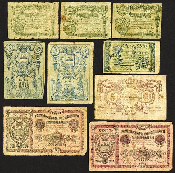 Belarus. 1 (3), 3, 5 (2), 10 (2) Rubles, two different 5s of one of the designs. Many with repairs to paper separation, paper loss, one trimmed. Good. 9 pieces.