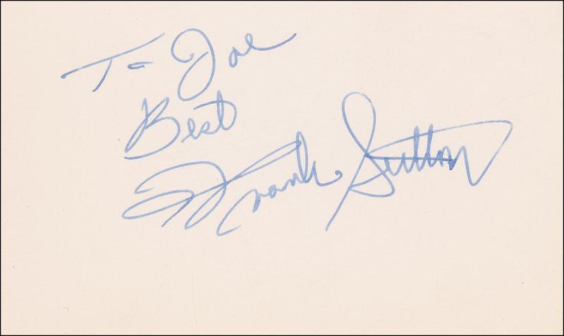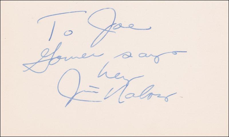 In-person ink signatures and inscriptions “To Joe, Gomer says hey, Jim Nabors,” and “To Joe, Best, Frank Sutton,” on individual off-white 5 x 3 cards. In very fine condition.