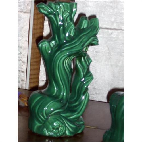 Two vintage tree trunk or driftwood lamps from the Gonder pottery company that was once here in Ohio. The green glaze is slightly different, but the same. The Tree trunk lamp is 11x5" without a shade. The driftwood lamp measures 12x6"w. and is listed in Gonders collector book as item #1226