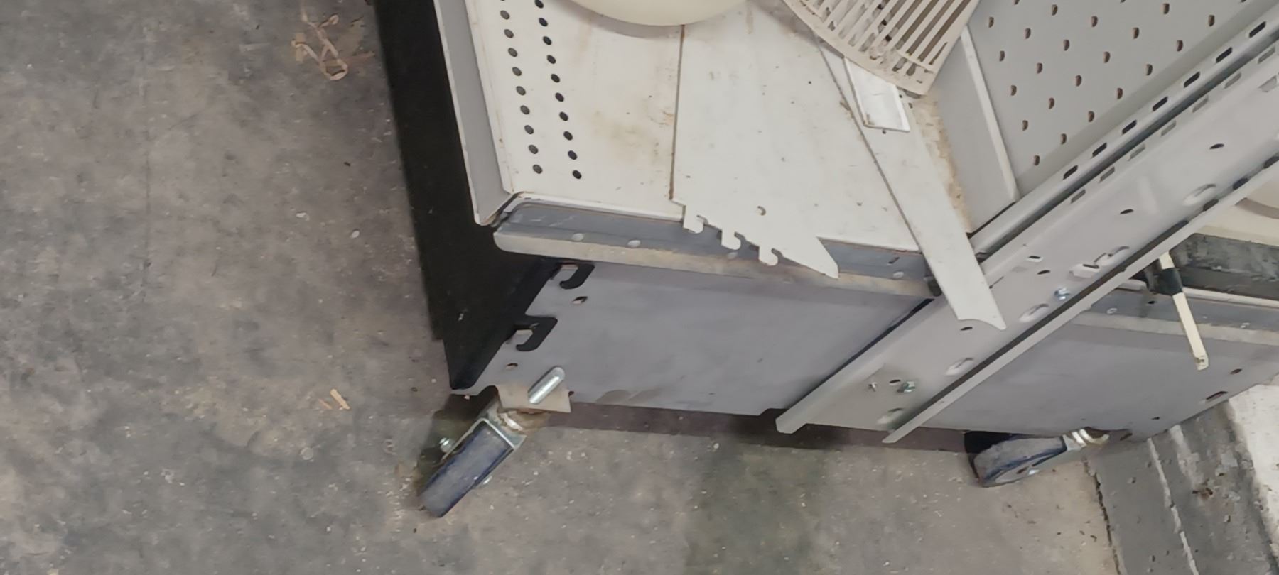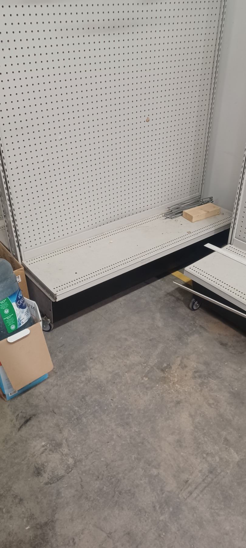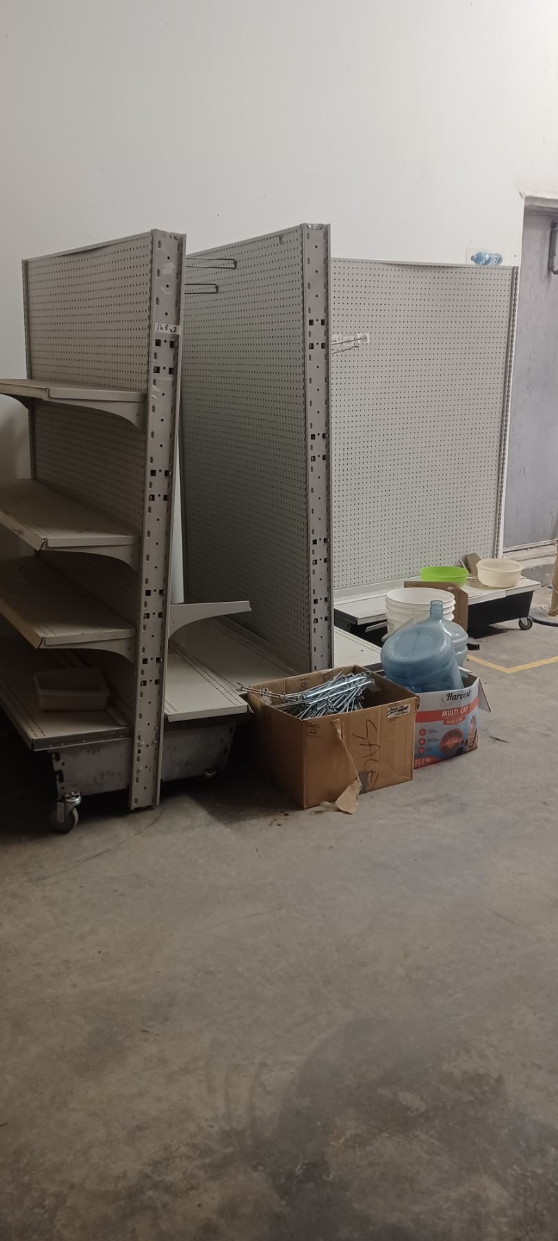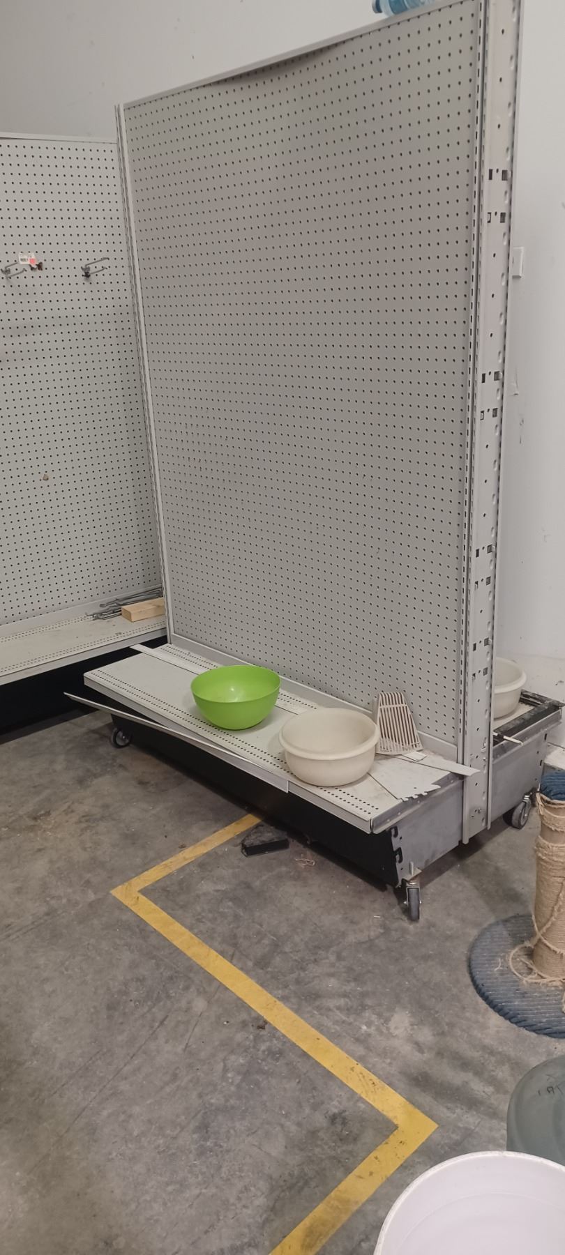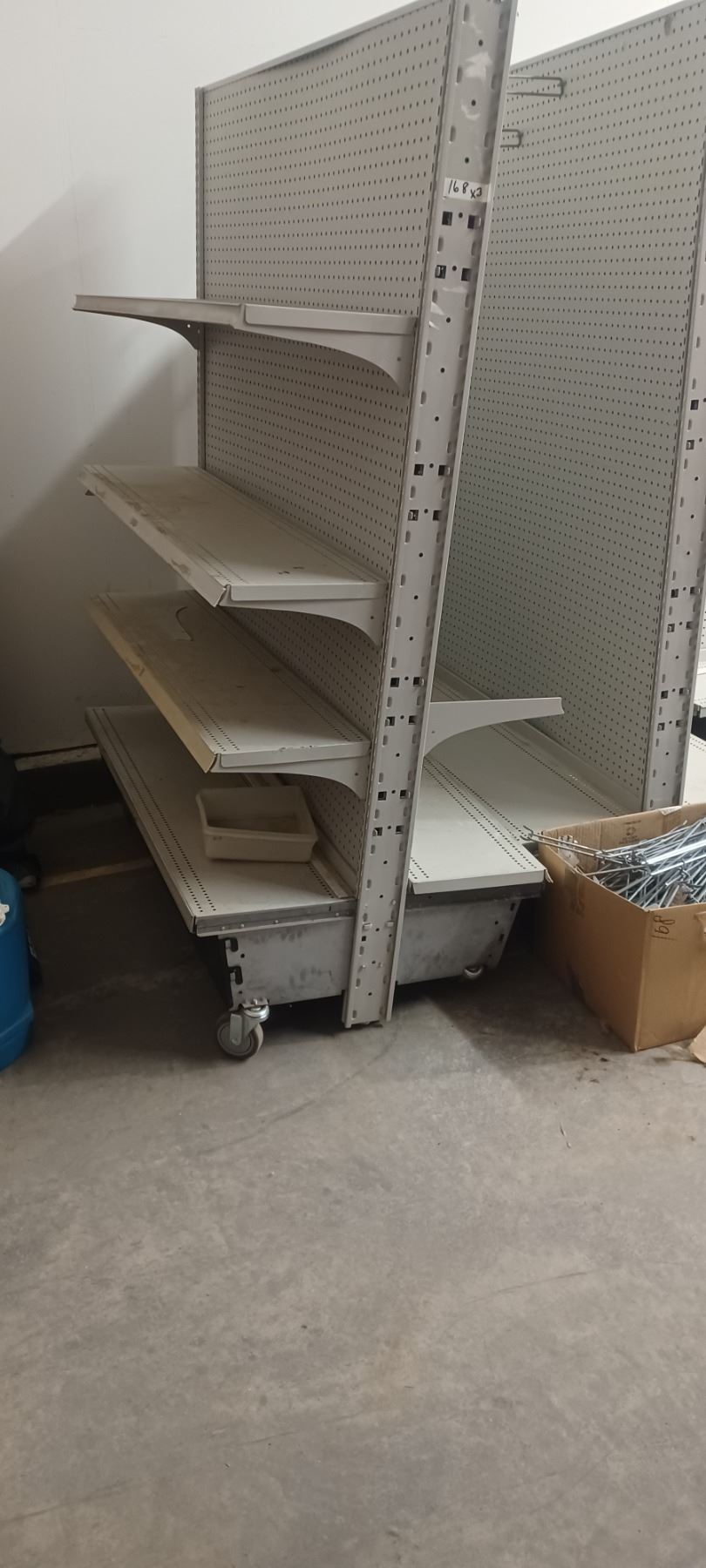 Gondola Shelving on wheels, 3pc's. c/w some shelves and hooks