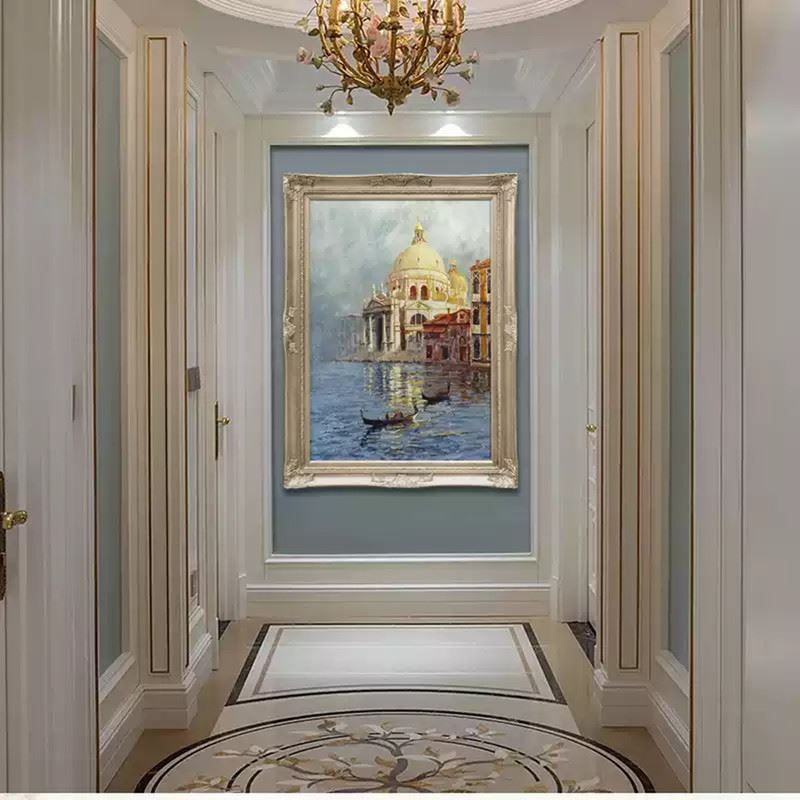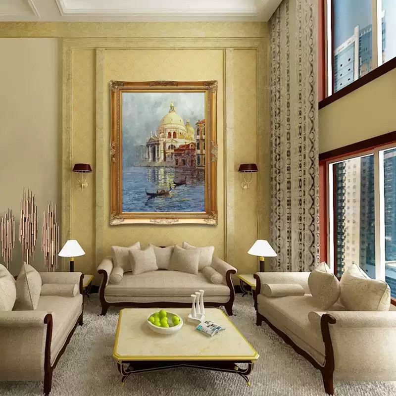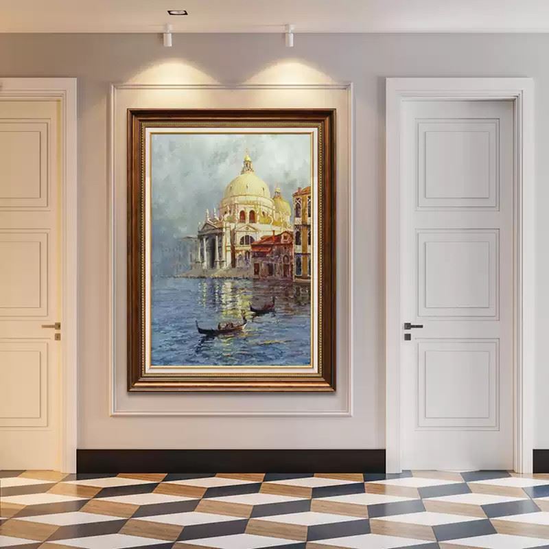 This serene painting captures the iconic gondolas gliding through the tranquil waters of Venice, with the majestic dome of the Santa Maria della Salute in the background. The soft, misty atmosphere and gentle reflections on the water convey a sense of calm and timeless beauty, typical of Venice's romantic charm. The subdued palette of blues and warm tones adds a sense of elegance and nostalgia to this quiet Venetian scene. Dimensions: 24 x 31 inches.