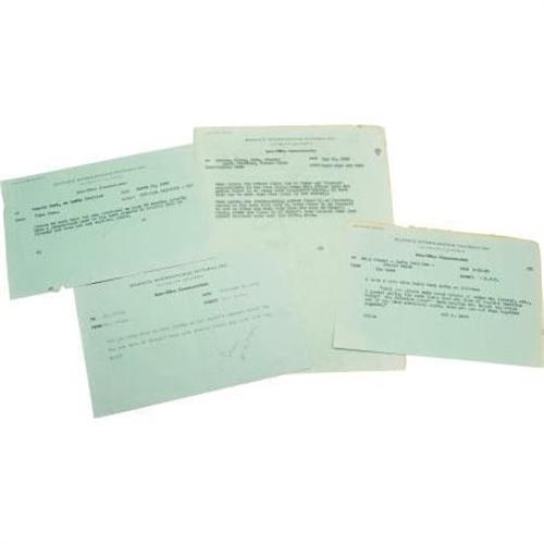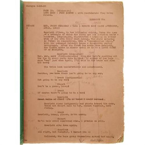 <B>"Gone WIth The Wind" Part One Script, with Annotations.</B></I> From the "FADE IN long shot of "Fort Sumter - with Confederate flag being raised" to Scarlett O' Hara's "...As God is my witness, I'll never be hungry again!" and "The Camera Finally Pulls Back to an Extreme Long Shot - A puff of early morning wind stirs the trees and bushes - like a harbinger of a new day, FADE OUT... " Such is the text of this original annotated Production Continuity Copy script for Part One of <I>Gone With the Wind.</B></I> The script is marked "1st part," dated February 27, 1939 , with script changes dated March through June. Additionally there are penciled-in changes, testimony to the obsessive drive of its perfectionist producer David O. Selznick. Various codes are penciled in the script, directions for the reading of lines (e.g., "coquettishly" for Scarlett's line to Rhett, "What do you want?"), indications of miniatures and work by Jack Cosgrove (who created special photographic effects) - all in all, enough amazing detail to make you feel you're immersed in the actual legendary production that won eight Oscars.The script is housed in a beautiful 9.5" x 12" book, with a gold leather spine, engraved <I>Gone With the Wind Screenplay Production Continuity Copy 1939.</B></I> A second book, 11" x 13 in size and engraved on the spine, <I>Gone With the Wind Production Memos 1939,</B></I> includes four interoffice memos between Cukor and Kern regarding the production (in Very Fine condition) and a vintage program book for the movie (Fine with moderate to heavy soiling and wear to the cover). The script pages are a bit aged, but the overall condition certainly rates a Very Fine. A spectacular <I>GWTW</B></I> artifact -- Clark Gable, Vivien Leigh and David Selznick seem to haunt its pages.<BR><BR><b>Shipping:</b> Books & Catalogs (<a target="_blank" href="http://www.heritageauctions.com/common/shipping.php">view shipping information</a>)