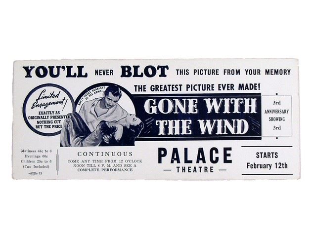 "Gone With The Wind" (1939) is of course considered one of the greatest films of all time, if not the most popular worldwide. And now that it is celebrating its 75th anniversary, interest in this classic is at its highest level, especially for collectors. This is an original very rare Ad Blotter for the Palace Theatre's 3rd Anniversary Showing of the film on Feb. 12th 1942. "Gone With The Wind" was one of the first films to stay in first run theaters for years, and have almost yearly revivals. This actual promotion blotter (used in the days when people used ink pens and dipped them in ink bottles), also has one of the worse ad campaigns ever: "You'll never BLOT this picture from our memory". Blotter is approx. 9"x4".