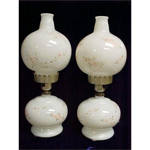 A pair of lovely hand painted Gone With The Wind Lamps. White glass with pink and gilt flowers, they are electric, and take a standard size light bulb. Lamps are 16? tall and are approximately 6 ½? at widest point. There are no makers marks on the lamps, but they are both in very good condition. Both are operational, but we would suggest having a qualified professional update the wiring.