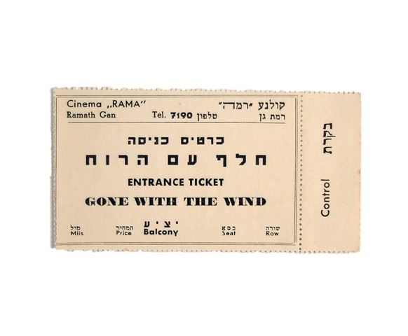 Gone With The Wind Original Israel Theatre Ticket (circa 1940's) - The staggering critical and box-office success of "Gone With The Wind" (1939) was not only an American phenomena, but stretched over the entire globe. The story of the struggle of Scarlett, and the Civil War itself hit a nerve throughout the world. War was on everyone's minds, and everyone was effected by the impending World War. So it hit a very personal nerve. This is an extremely rare original unused complete Ticket from the famous Ramat-Gan Theatre in what was to become Israel after the war. At the time, the region was a virtual battleground, and the movie became a virtual anthem for the population who swarmed the theater to watch the film over and over again. With the 75th Anniversary of "Gone With The Wind" upon us, all "Wind" memorabilia has extra special value. The ticket is in Hebrew. Displayed in a protective sleeve. Original ticket is approx 4.5"x3".