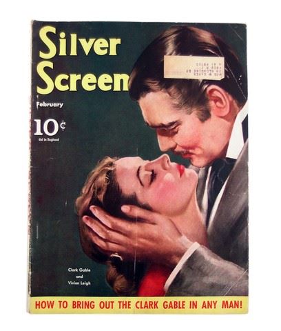 Gone With The Wind Original Silver Screen Magazine (1940) - In the days long before TV and the Internet, the world got its fix of everything Hollywood from special glamour Magazines. Many dreams were both created and dashed from spending hours reading about the world of the great stars and the paradise that was Hollywood. Perhaps the most popular of these magazines was "Silver Screen". This is one of the most prized editions. The February 1940 special "Gone With The Wind" edition with the poster art of Clark Gable and Vivien Leigh on the cover. Being that this year is the 75th anniversary of what is considered the greatest film ever made, gives this even greater value. It includes the original Postal label. In Good condition with only slight wear on the binding and small 'bend marks" on the cover.