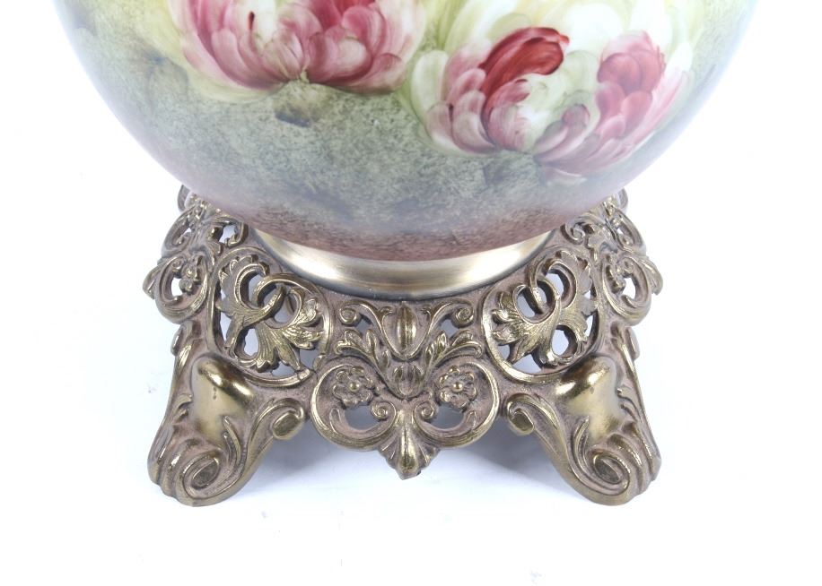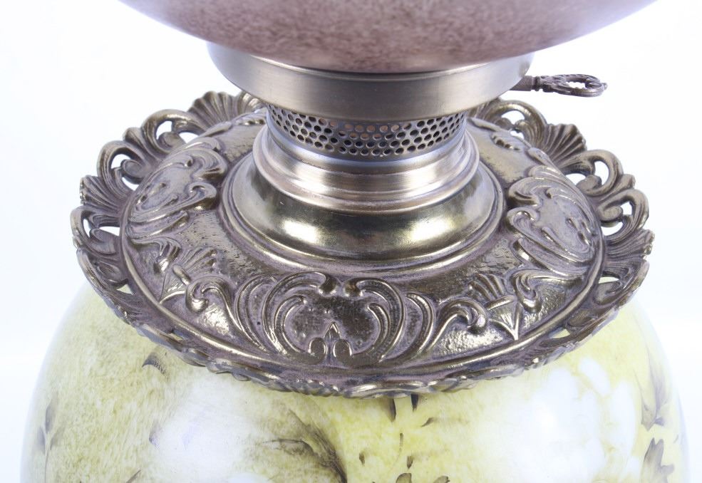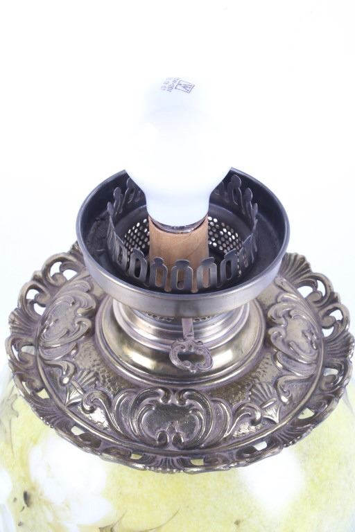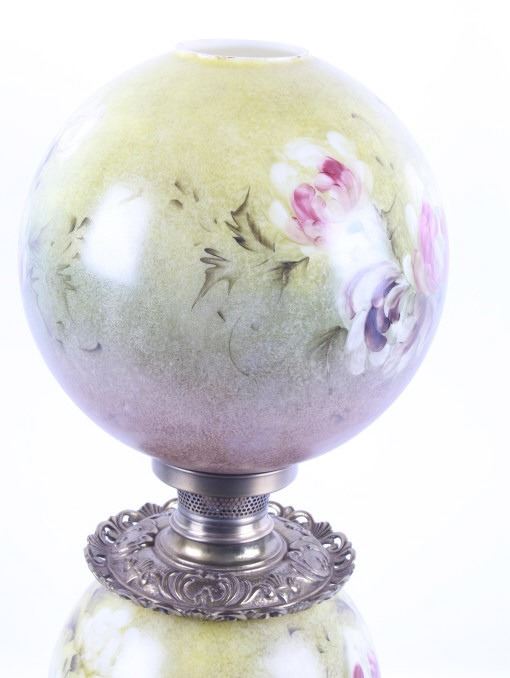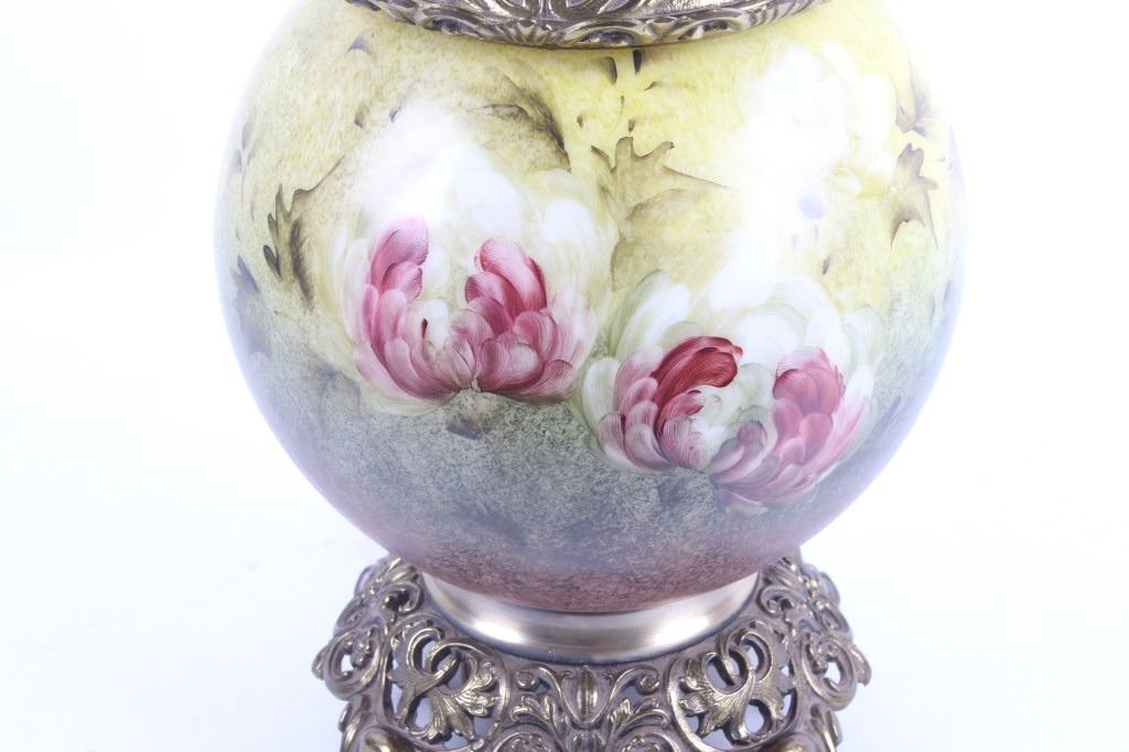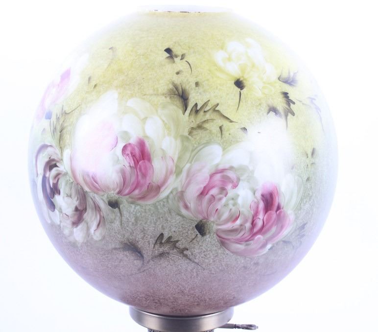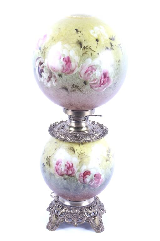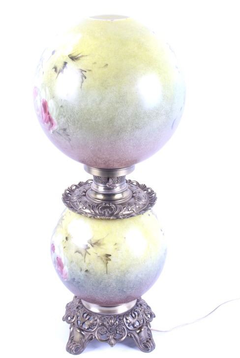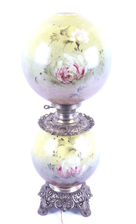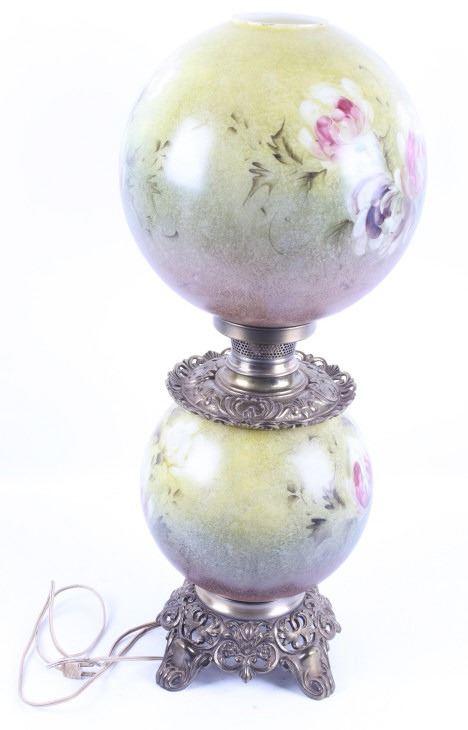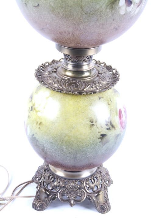 Included in this lot we have a Gone with the Wind painted glass parlor converted lamp originating from the early to mid 1900's. The lamp displays brass construction with two large decorative glass globes. The brass displays wonderful floral and vine designs across the exterior. The globes are hand painted with modeled greens and browns with white and purple flowers across the globes. The lamp was originally constructed as a oil lamp, but has been converted to an electrical lamp. The piece shows good condition overall with light wear due to age. The lamp measures 27 1/4" tall by 11" in diameter.