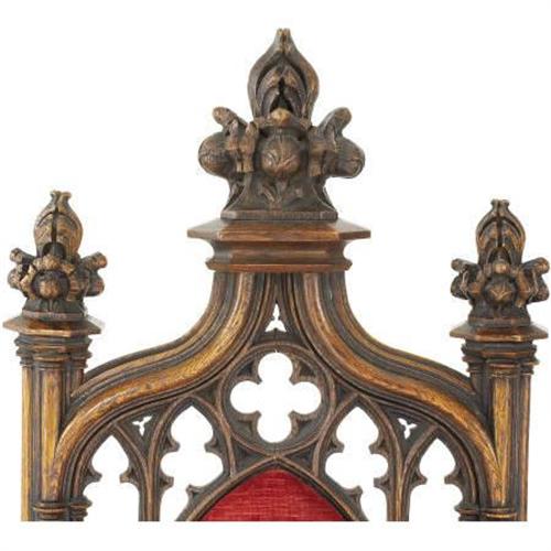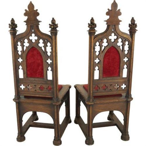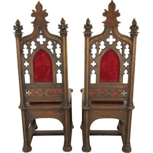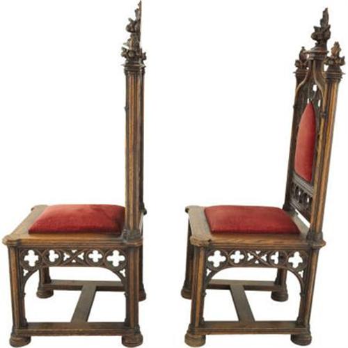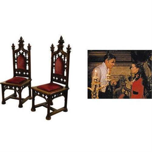 <B><I>Gone With The Wind</B></I></B></I> <B>Screen-Used Side Chairs.</B></I> A vestige of the opulence of the Old South, as magnificently recreated in David O. Selznick's <I>Gone With the Wind,</B></I> this set of two screen-used side chairs survived the troubled 1939 production of the beloved epic. Highly visible in the Reconstruction-era Butler estate, the chairs were used in multiple scenes, specifically flanking the massive dining table of the Butler home. Constructed in oak, the legs and stiles are of clustered columns, the legs sitting on round stepped base and connected with an "H" stretcher. The back is in an ogee arch with quatre foil tracery framing an arched chenille upholstered inset. The seat mimics the columnar legs, with octagonal corners, and at center is a chenille upholstered inset. Repeating the quatre foil tracery of the back, the seat is supported on three sides with tracery raising up on arching from the leg. Originally acquired from the historic MGM auction of props and wardrobe, the chairs were subsequently displayed in the rare book store Heritage Book Shop (not affiliated with Heritage Auctions) in West Hollywood. Accompanying the lot is a <I>New York Times</B></I> article on Heritage Book Shop referencing the chairs and their inclusion in <I>Gone With the Wind,</B></I> as well as images of the chairs from the film. Measuring 35" x 20" x 21.75", the chairs are in Fine condition with some nicking, minor decorative loss and separating of decorative joints.<B>Condition Report:</B> Side 1 - Wear normal to age, base of left stile is missing the interior lobe. Damage to rear of right stile where meets finial. Nicking to rear of back legs, and nick in back seat rail. Some seperation on joints of decorative joints. Marked "BEH-RP-248" in white.Side 2 - Wear normal to age. Deep scratch on left stile. Nick on seat. damage bo base of right back leg. Heary nicking to front leg. Seperating of some decorative joints.Side 3 - Wear normal to age. Missing inside of lobe of capital of each stile at transition to finial. Nicking to leg fronts and stiles. Some seperating of joints in decorative tracery.Armchair - Wear normal to age. Cracking in tracery over upholstered inset. Nicking of legs and stiles. Damage to streatcher on right side. Nicking to tracery of left arm support. Marked "BEH" faded numbers in white.<BR><BR><b>Shipping:</b> Requires 3rd Party Shipping (<a target="_blank" href="http://www.heritageauctions.com/common/shipping.php">view shipping information</a>)